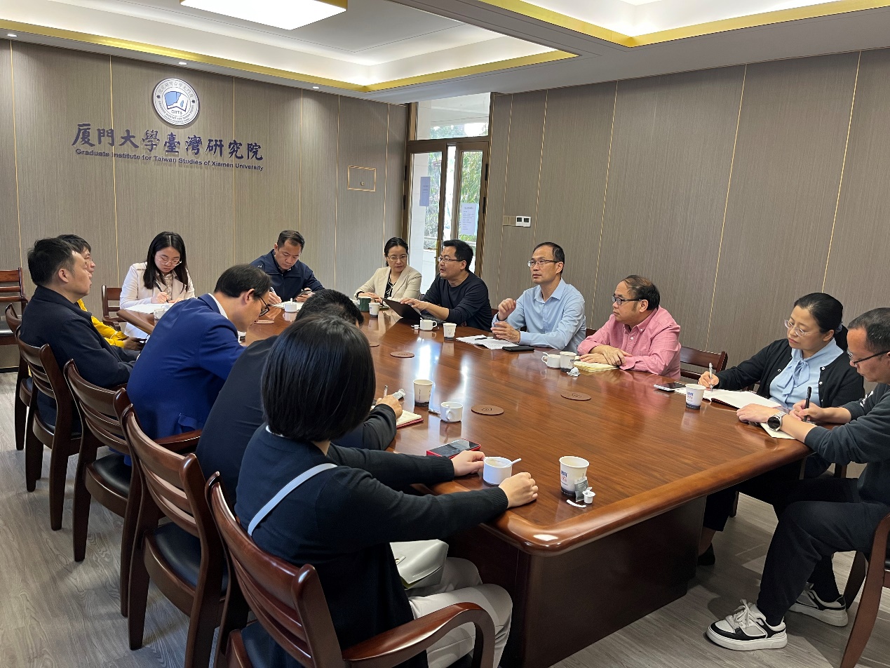 为深入贯彻落实《中共中央 国务院关于支持福建探索海峡两岸融合发展新路 建设两岸融合发展示范区的意见》,加强两岸融合发展示范区建设的科研力量支持,3月29日上午,《厦门大学学报(哲社版)》编辑部主任黄寿峰教授、副主任陈双燕编审一行到研究院开展调研交流活动。院党委书记郭锦星、副院长张羽教授、副院长张文生教授、《台湾研究集刊》主编王华教授、港澳台研究中心主任张宝蓉教授等教师代表参加了调研活动。