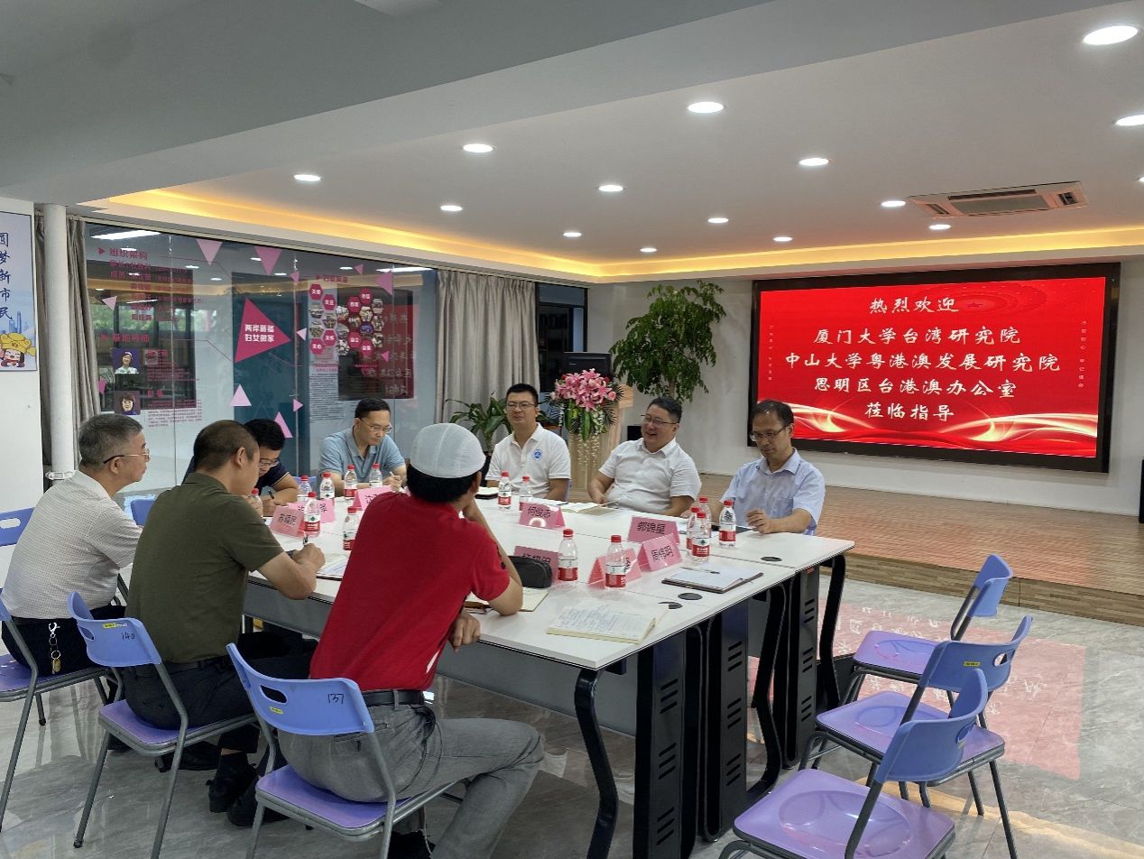 2023年9月27日上午,厦门大学台湾研究院郭锦星书记、沈惠平老师陪同中山大学粤港澳发展研究院何俊志院长、伍俐斌老师到厦门市思明区中山路龙威台湾青年创业就业基地调研台青在大陆创业情况。思明区台港澳办石世彬主任以及许竞择、苏硕民、周伟民等台港澳办干部,以及龙威基地负责人叶石培、杨超闳(台青)参加了座谈会。