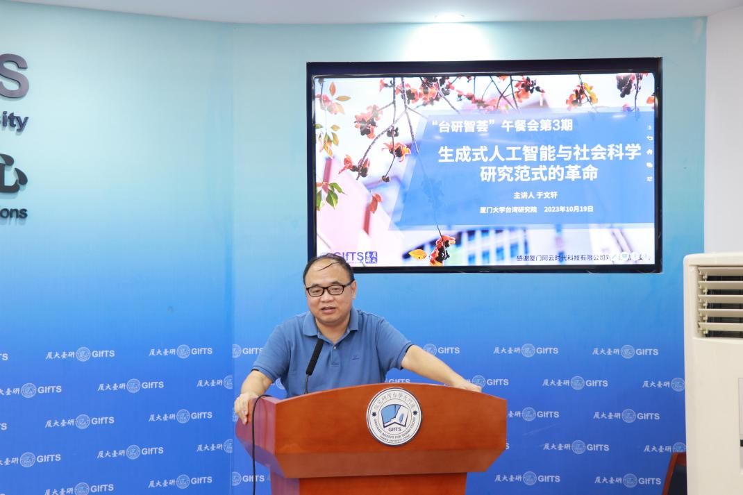 10月19日中午,第3期“台研智荟”午餐交流会在台湾研究院507报告厅顺利举行。本场午餐会特别邀请了厦门大学公共事务学院院长、闽江特聘教授于文轩作题为“生成式人工智能与社会科学研究范式的革命”的专题讲座报告。