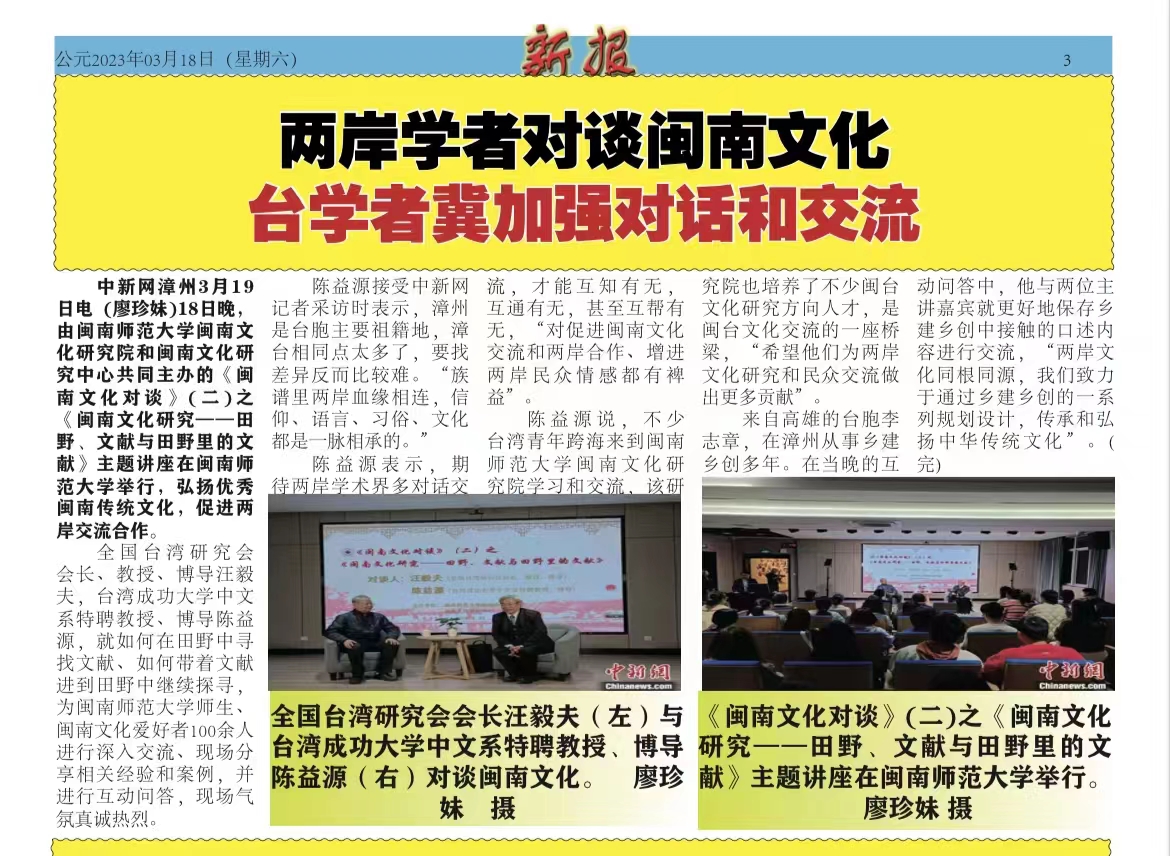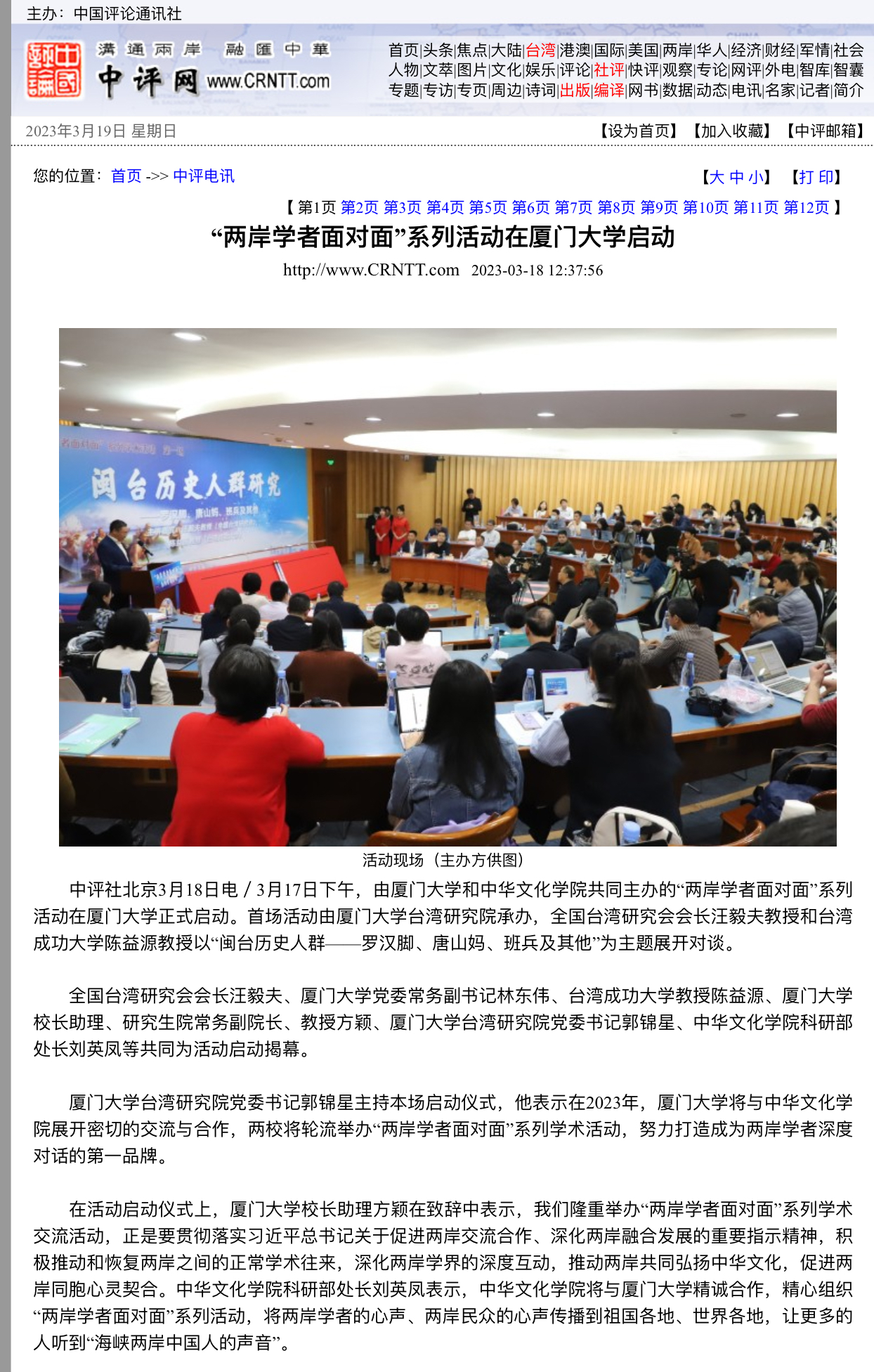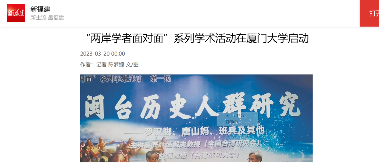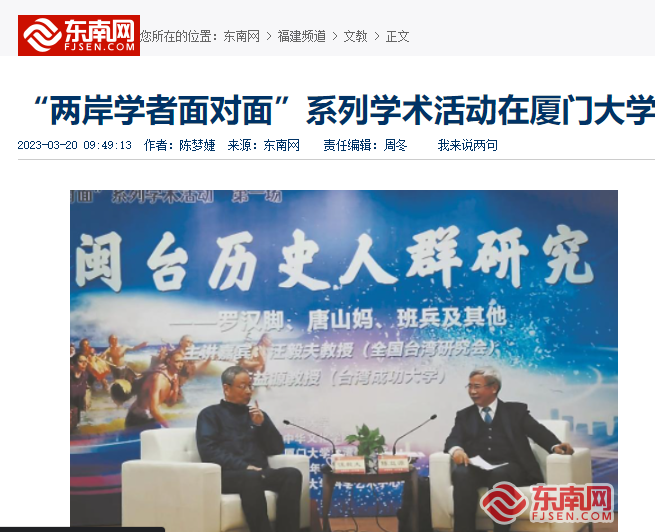 3月17日下午,由厦门大学和中华文化学院共同主办的“两岸学者面对面”系列活动在厦门大学正式启动。首场活动由厦门大学台湾研究院承办,全国台湾研究会会长汪毅夫先生和台湾成功大学陈益源教授以“闽台历史人群——罗汉脚、唐山妈、班兵及其他”为主题展开对谈。该活动引起了媒体的广泛关注。