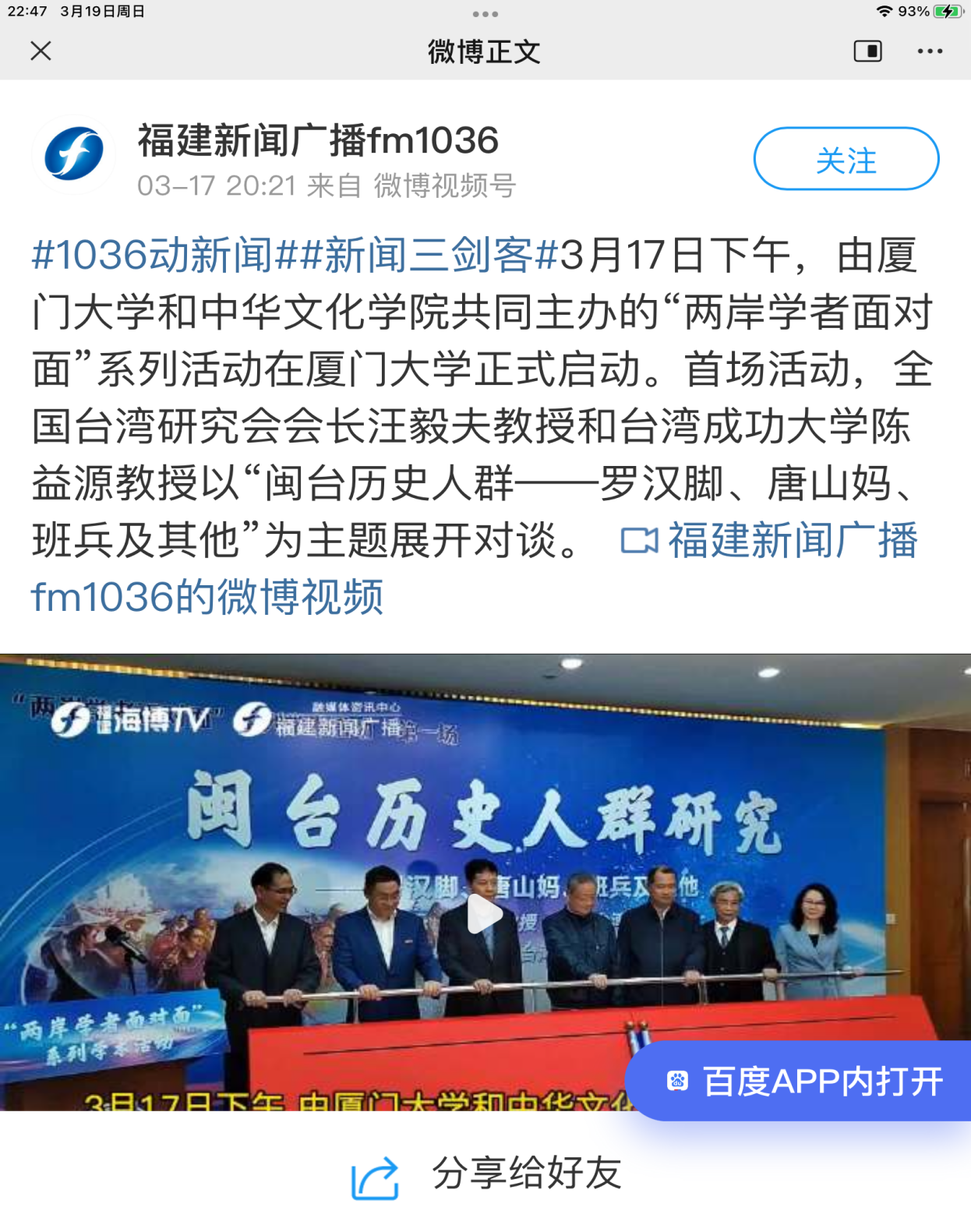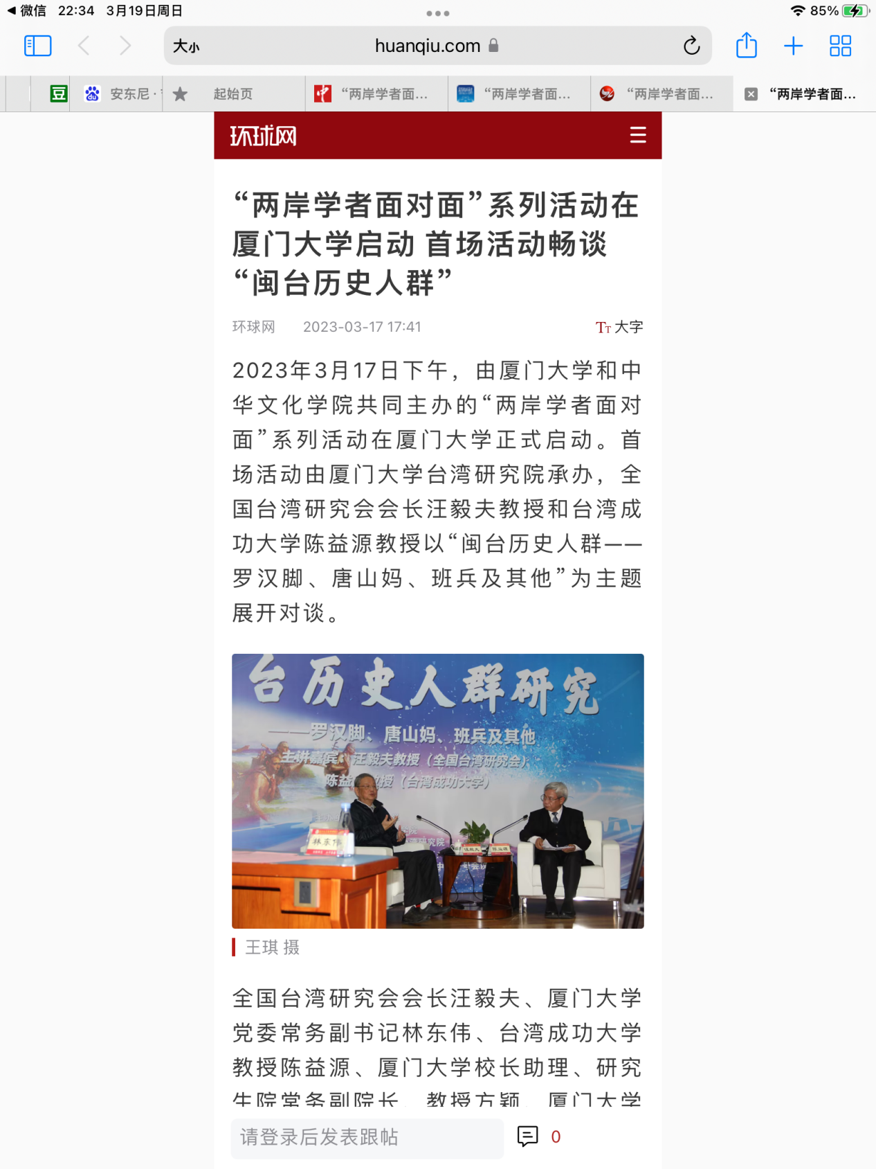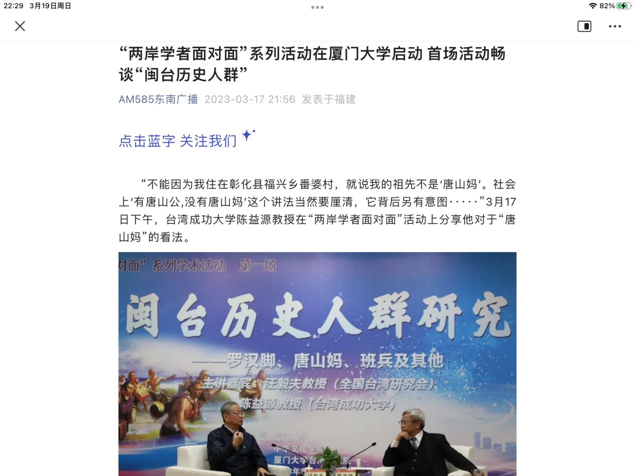 3月17日下午,由厦门大学和中华文化学院共同主办的“两岸学者面对面”系列活动在厦门大学正式启动。首场活动由厦门大学台湾研究院承办,全国台湾研究会会长汪毅夫先生和台湾成功大学陈益源教授以“闽台历史人群——罗汉脚、唐山妈、班兵及其他”为主题展开对谈。该活动引起了媒体的广泛关注。