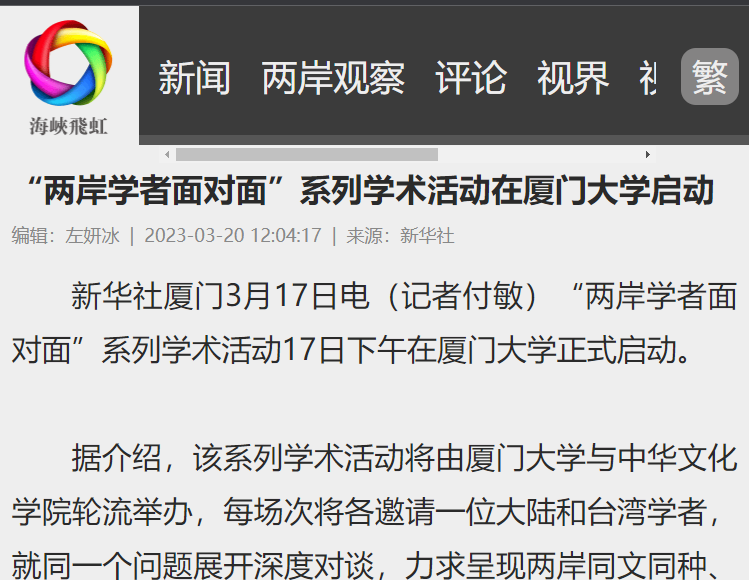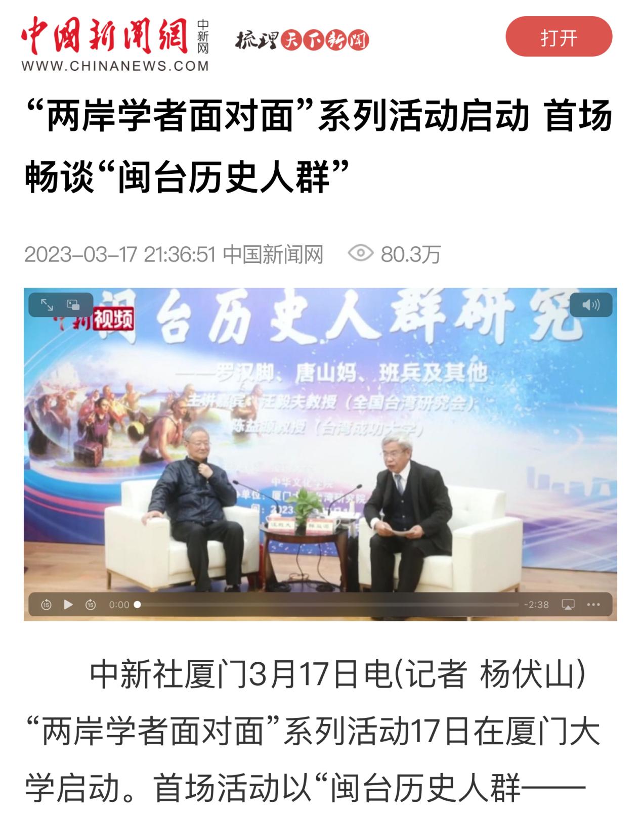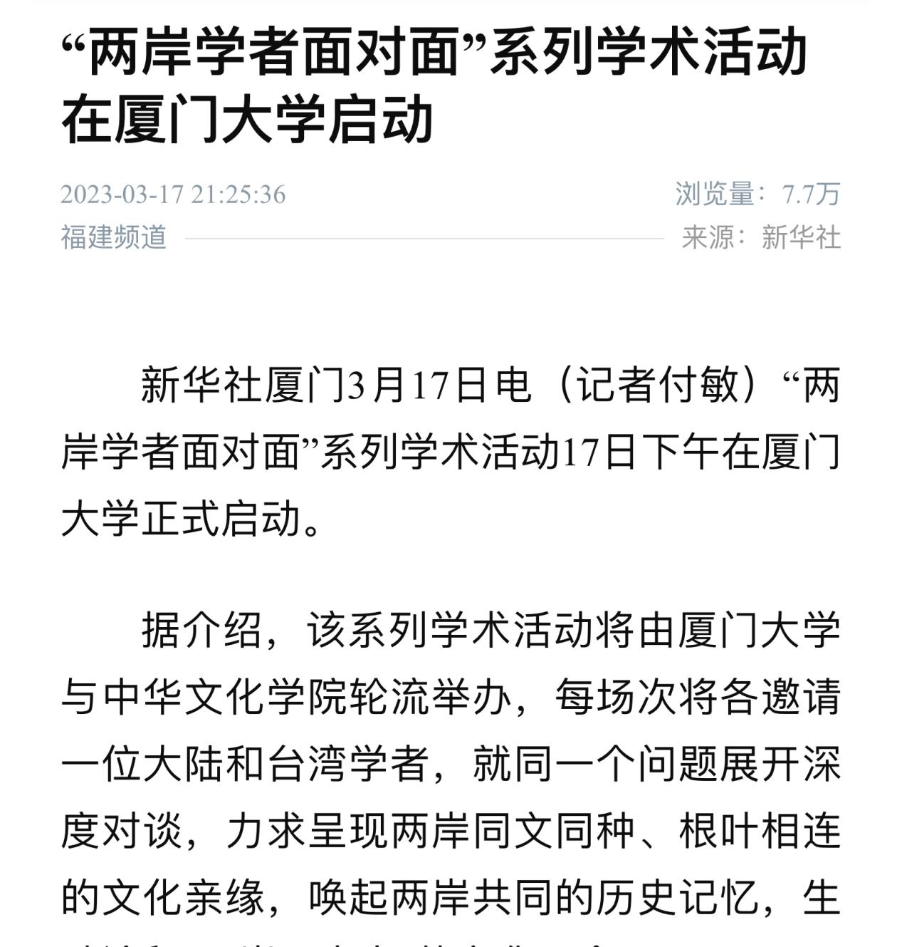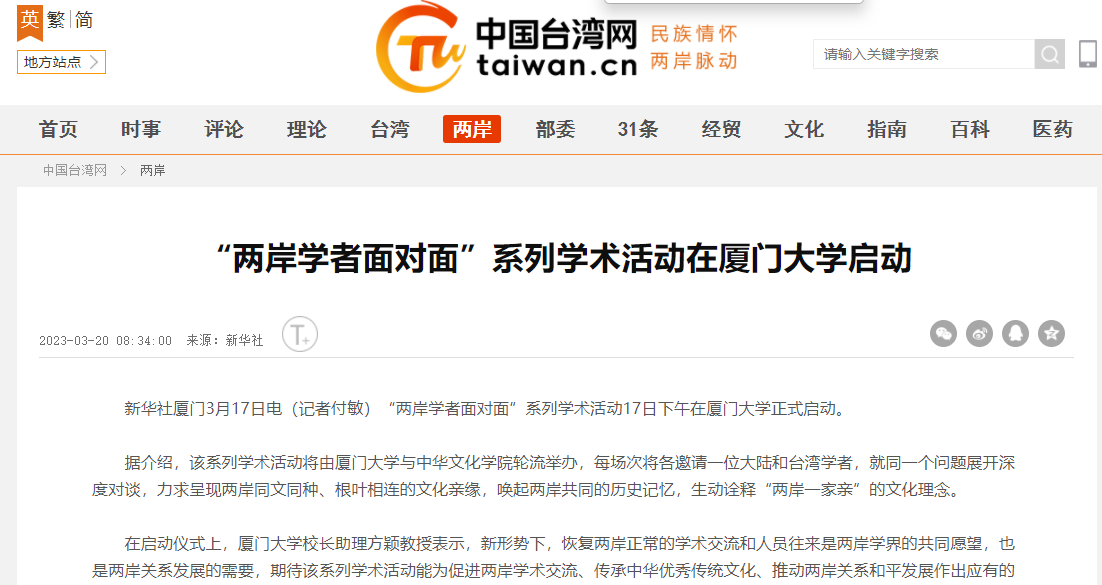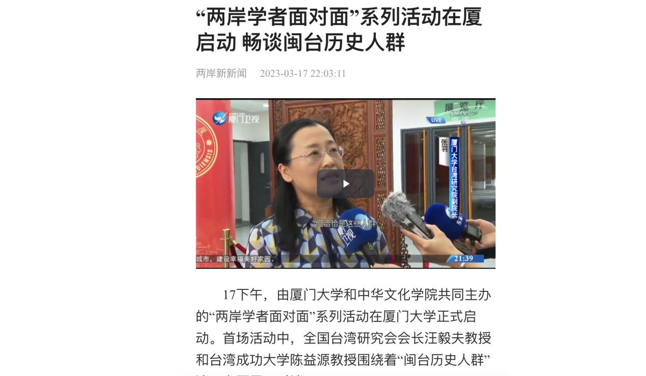 “两岸学者面对面”系列学术活动旨在增强两岸学术交流,拓宽学术视野,进一步增进两岸情感融合。本次活动获得了各大媒体的广泛关注,新华社、央视、中新社、环球网、中评社、中央人民广播电视台、东南卫视、海峡卫视、厦门卫视、福建电视台、中国日报、福建日报、东南广播、海峡导报等涉台媒体均派员采访,涉及重量级通讯社、央媒、卫视、省级电视台、网站、报刊、新媒体(微信、微博、抖音多个平台)等各类型媒体。各大媒体采用融媒体传播方式,利用各自媒体的特色与优势,对本次活动进行传播和宣传。与此同时,中央相关部门官网、各类型媒体也积极进行转载,诸如中共中央统一战线工作部官方网站、人民网、中国台湾网、华夏经纬网、央视网、看台海、东南网、凤凰网等,百度、新浪、网易、腾讯等网站也对此次报道进行大规模转载,进一步增强了本活动的影响力。
