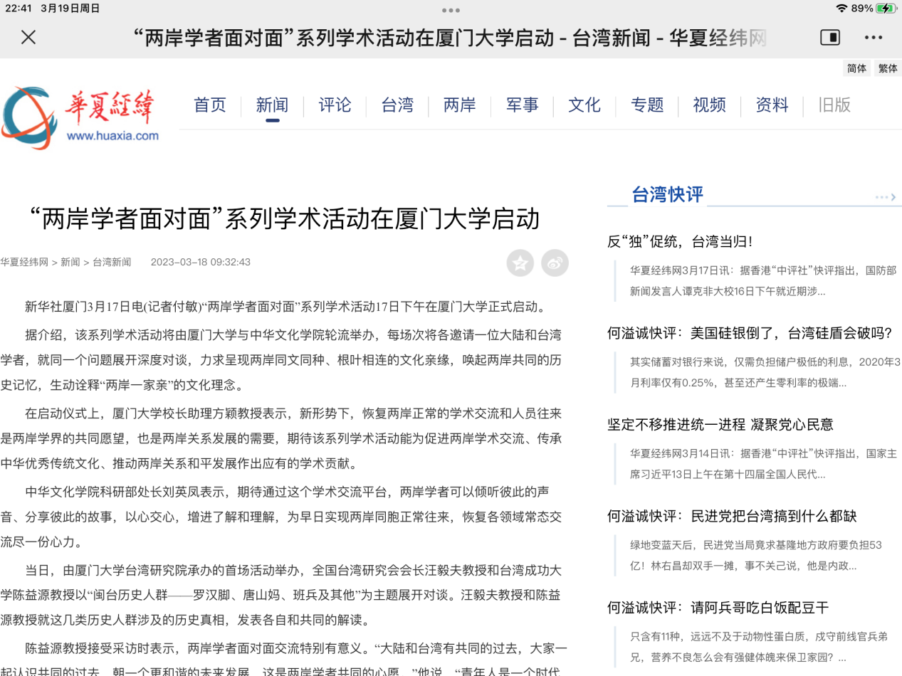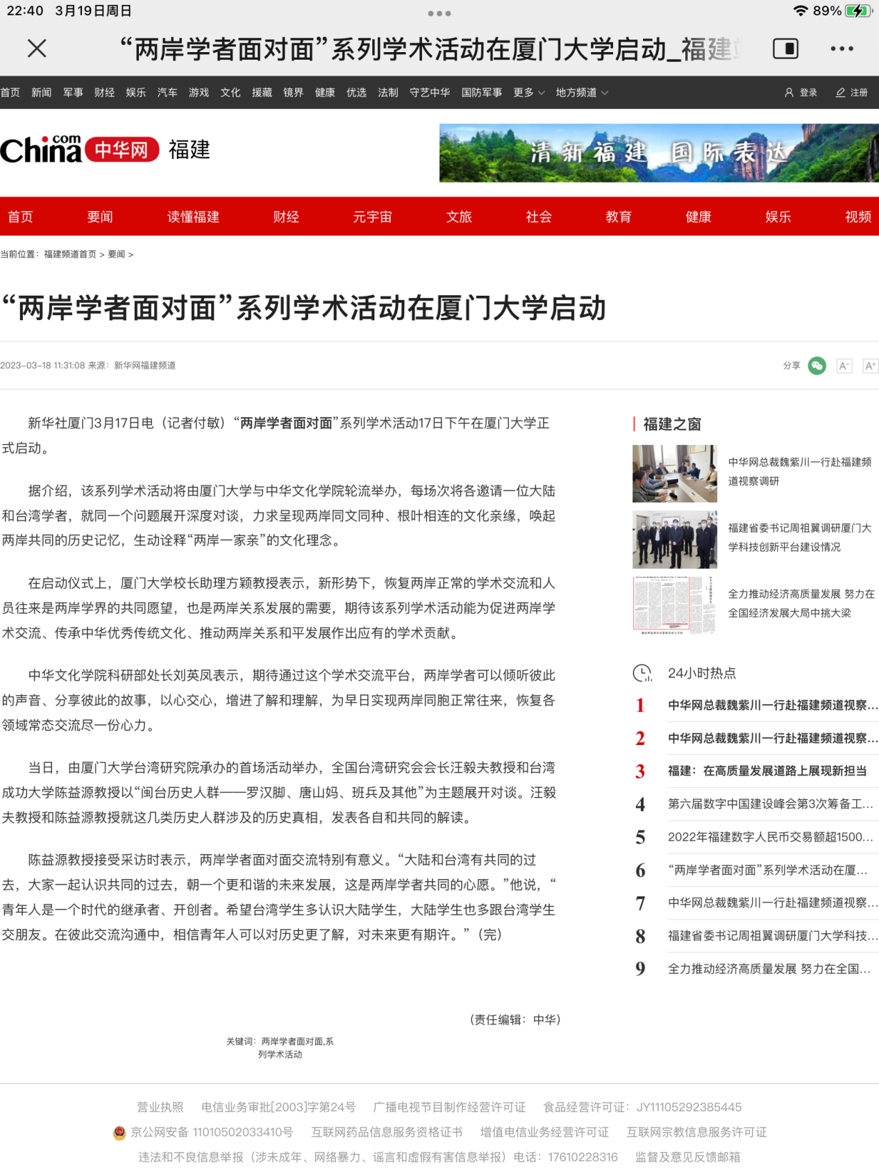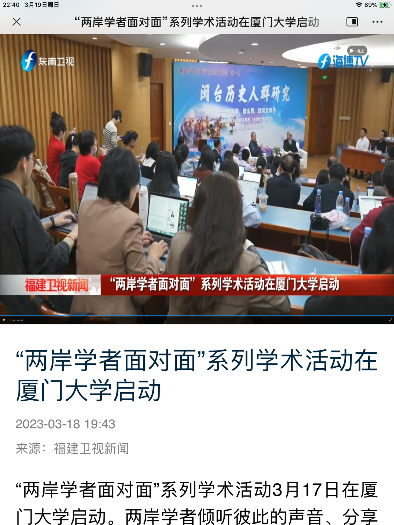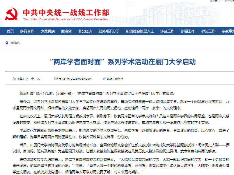 “两岸学者面对面”系列学术活动旨在增强两岸学术交流,拓宽学术视野,进一步增进两岸情感融合。本次活动获得了各大媒体的广泛关注,新华社、央视、中新社、环球网、中评社、中央人民广播电视台、东南卫视、海峡卫视、厦门卫视、福建电视台、中国日报、福建日报、东南广播、海峡导报等涉台媒体均派员采访,涉及重量级通讯社、央媒、卫视、省级电视台、网站、报刊、新媒体(微信、微博、抖音多个平台)等各类型媒体。各大媒体采用融媒体传播方式,利用各自媒体的特色与优势,对本次活动进行传播和宣传。与此同时,中央相关部门官网、各类型媒体也积极进行转载,诸如中共中央统一战线工作部官方网站、人民网、中国台湾网、华夏经纬网、央视网、看台海、东南网、凤凰网等,百度、新浪、网易、腾讯等网站也对此次报道进行大规模转载,进一步增强了本活动的影响力。