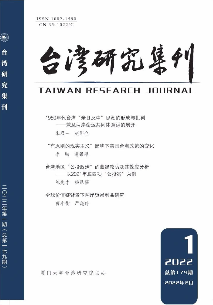 《台湾研究集刊》(双月刊)系厦门大学主管、厦门大学台湾研究院主办的中文学术期刊。该刊是祖国大陆最早创办的专门研究台湾问题的学术刊物,现为中国期刊方阵双效期刊、中国人文社会科学期刊AMI综合评价(A刊)核心期刊、中文社会科学引文索引(CSSCI)扩展版来源期刊、中国学术期刊综合评价数据库来源期刊。《台湾研究集刊》以沟通海峡两岸学术交流、促进祖国和平统一为宗旨,集中刊载有关台湾问题与两岸关系的政治、经济、法律、社会、人文等各领域研究成果,致力于打造台湾研究的高质量成果发表与交流平台,创设有助于两岸关系发展和两岸同胞心灵契合的学术思想和舆论氛围。