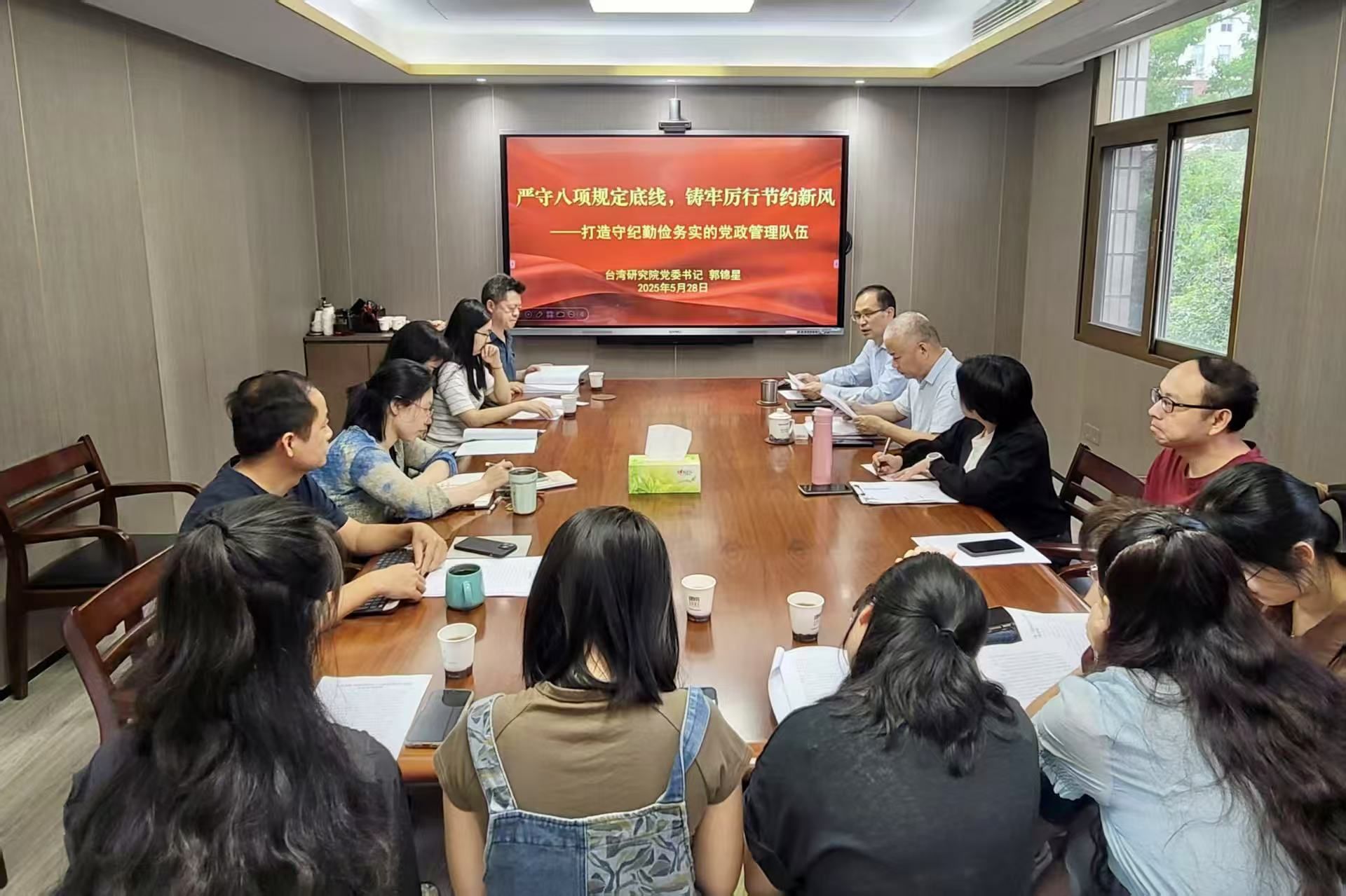 郭锦星书记在党课最后提出三点要求,一是针对在学习教育中查摆出的问题,要坚持学查改一体推进,未来需强化制度执行力,压实责任链条,完善全流程闭环监督机制。二是党政管理人员要认真学习贯彻新修订的《党政机关厉行节约反对浪费条例》,准确把握《条例》中有关经费管理、公务接待、会议活动、资源节约等核心内容。三是党员干部要把用规贯穿于履职尽责的全过程。师生党员要把优良作风融入到科研教学和对台研究工作的各环节。让制度之力转化为发展动能,让学习教育在推动研究院高质量发展中走深走实。
