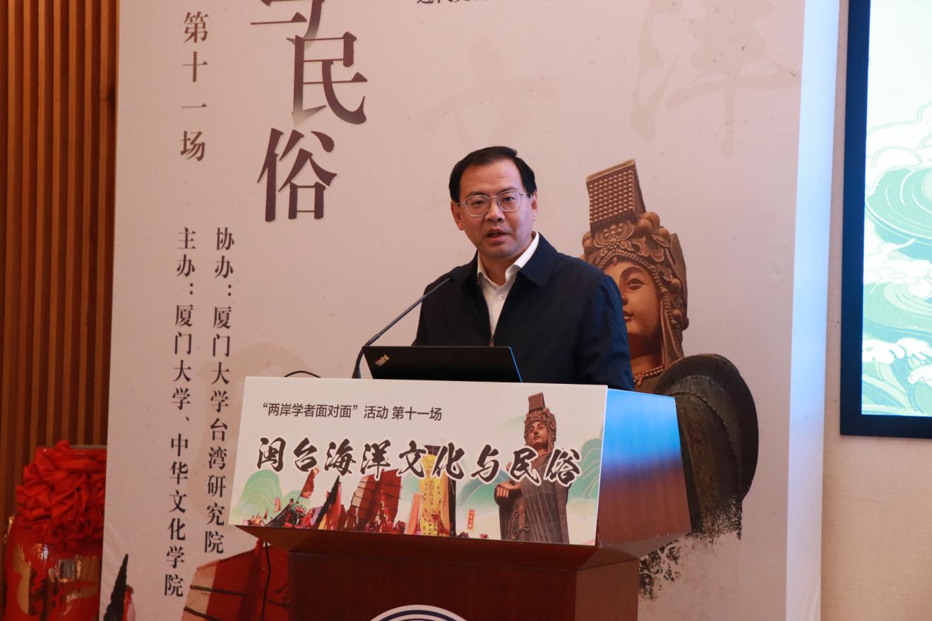 厦门大学台湾研究院院长李鹏在致辞中对各位嘉宾的莅临表示了热烈的欢迎和衷心的感谢,并回顾了过去一年“两岸学者面对面”系列学术活动的取得的丰硕成果。他指出,海洋性是闽台社会的文化底色之一,由海洋文化衍生出的闽台民俗是中华传统文化的重要组成部分,也联结了两岸民众的精神世界。他表示,此次对谈聚焦闽台海洋文化与民俗的主题,通过两岸资深学者的深度互动,为共同弘扬中华文化,促进两岸同胞心灵契合有重要意义。