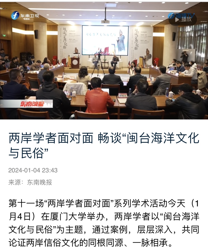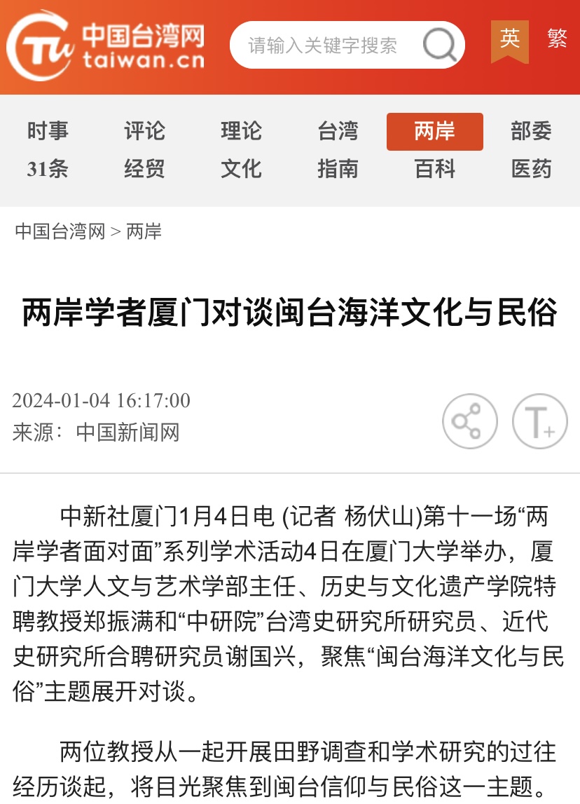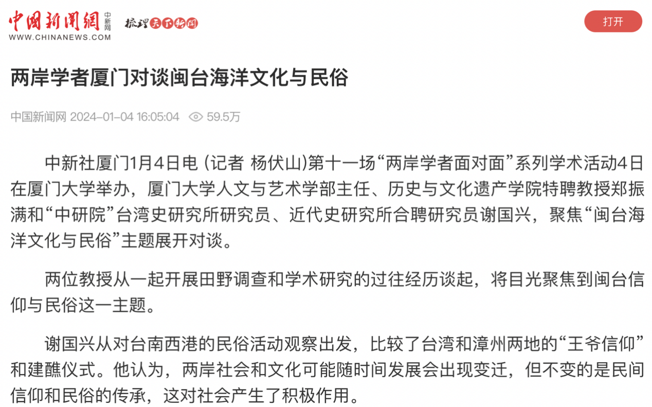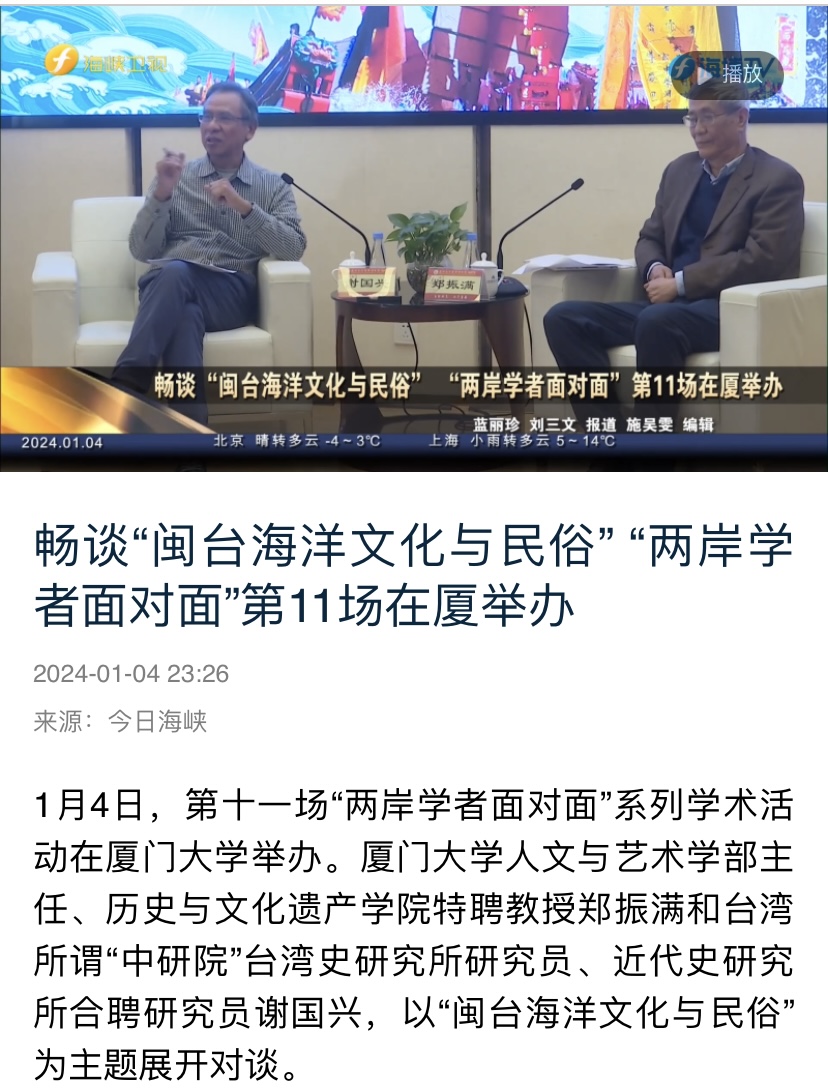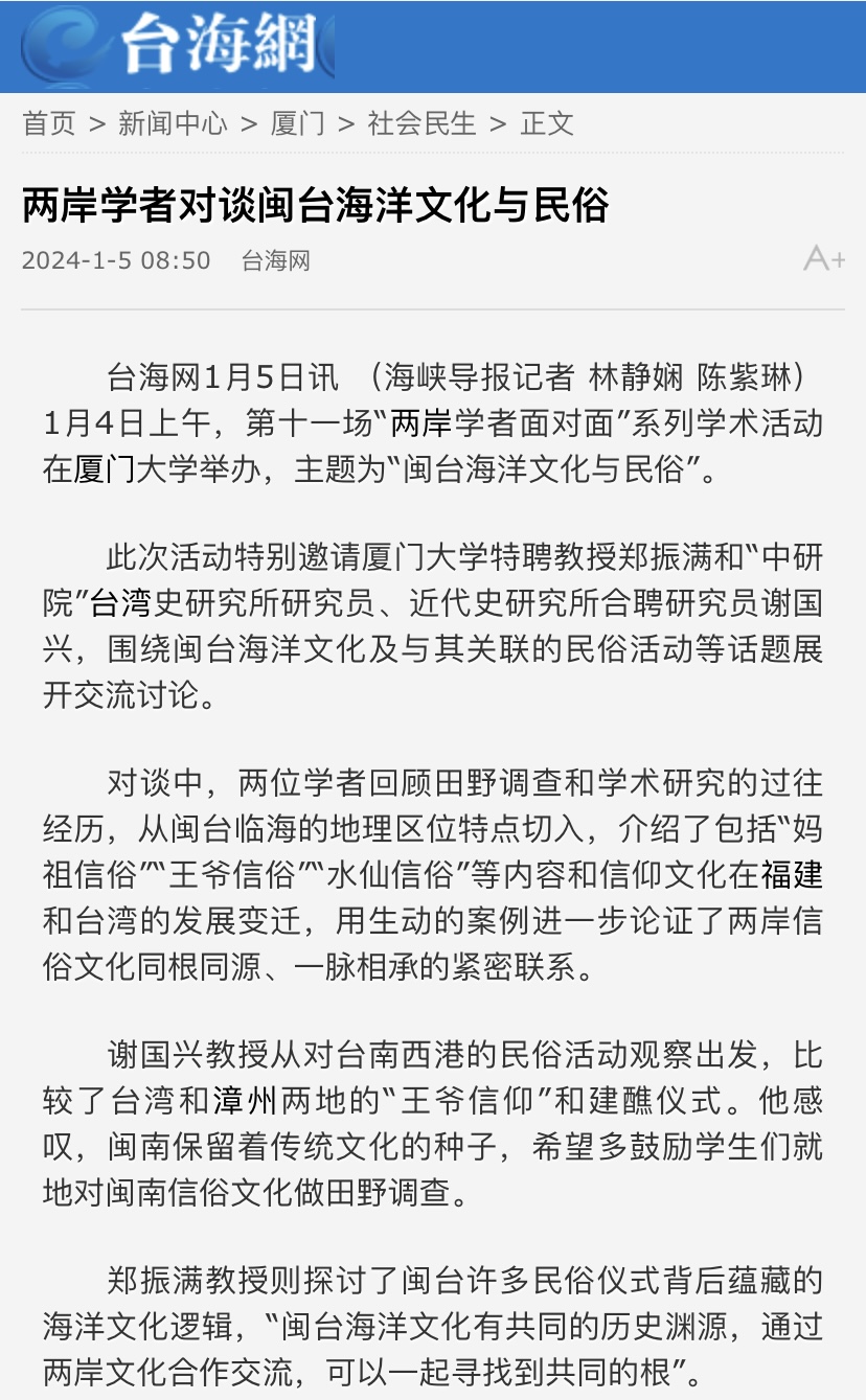 近日,由厦门大学和中华文化学院共同主办的“两岸学者面对面”系列活动第十一场在厦门大学科学艺术中心举办。厦门大学人文与艺术学部主任、历史与文化遗产学院特聘教授郑振满和“中研院”台湾史研究所研究员、近代史研究所合聘研究员谢国兴以“闽台海洋文化与民俗”为主题展开对谈。该活动引起了海内外媒体的广泛关注。