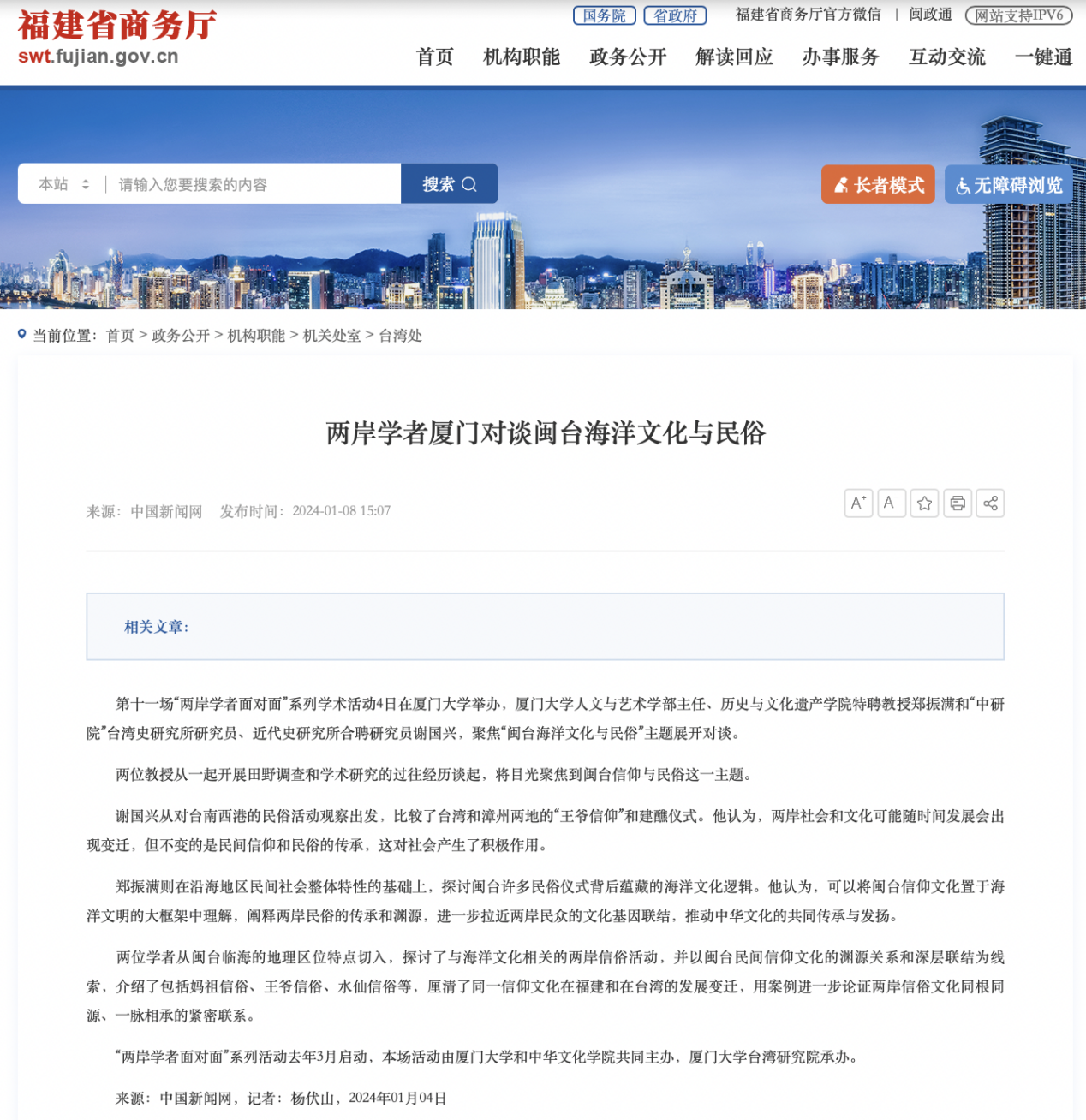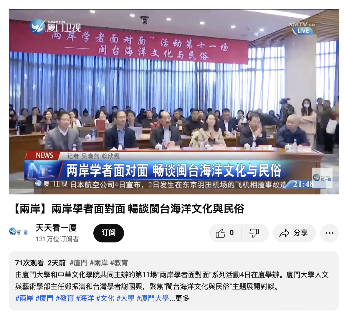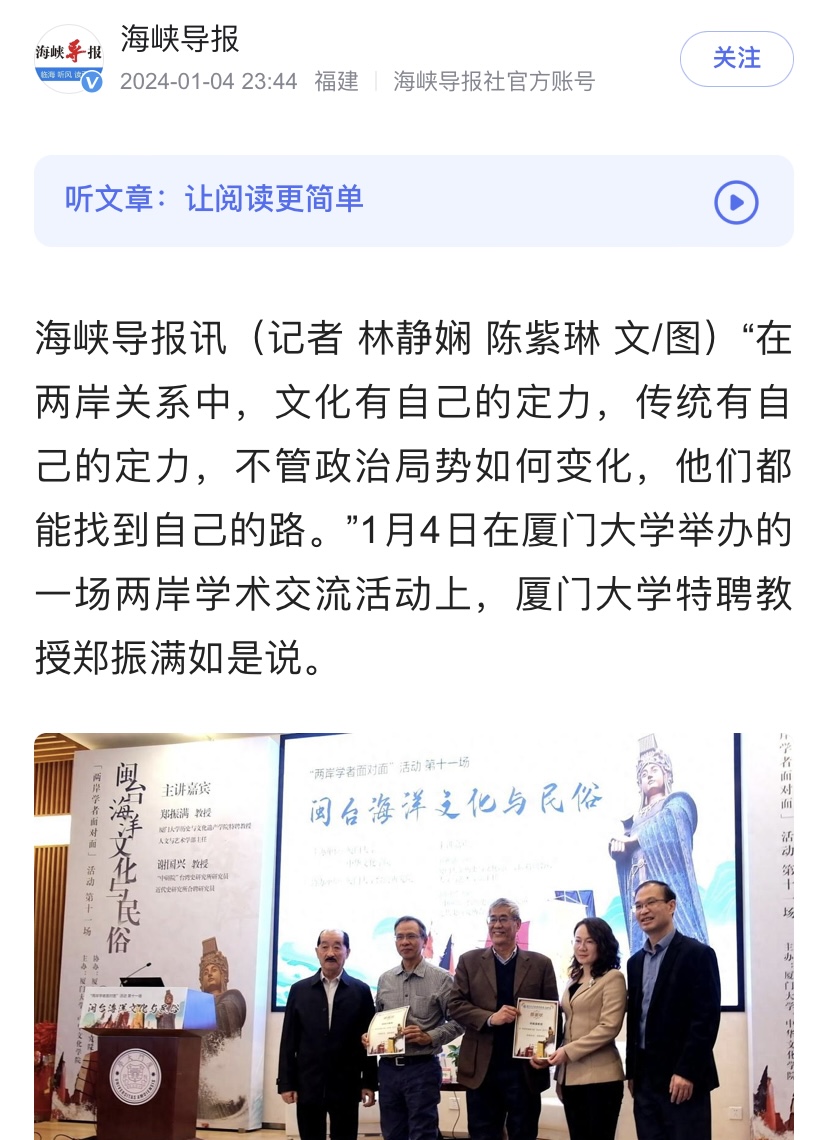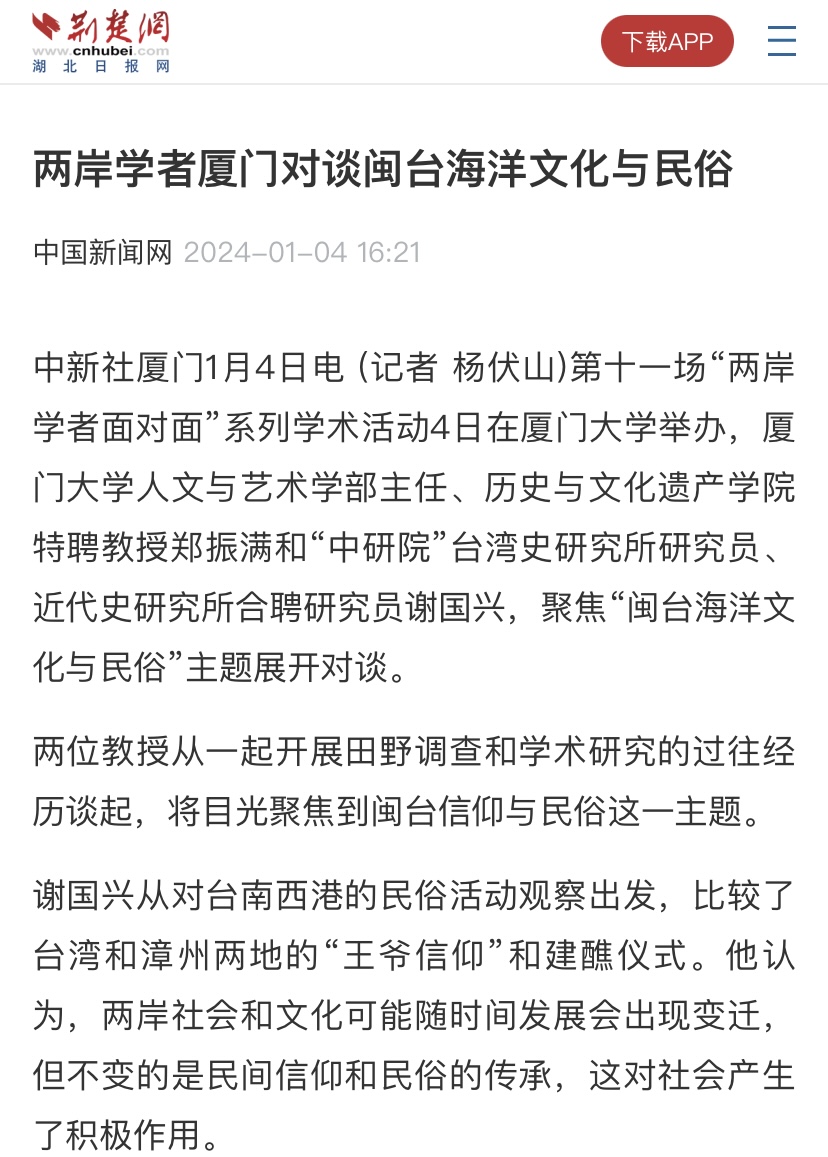 近日,由厦门大学和中华文化学院共同主办的“两岸学者面对面”系列活动第十一场在厦门大学科学艺术中心举办。厦门大学人文与艺术学部主任、历史与文化遗产学院特聘教授郑振满和“中研院”台湾史研究所研究员、近代史研究所合聘研究员谢国兴以“闽台海洋文化与民俗”为主题展开对谈。该活动引起了海内外媒体的广泛关注。