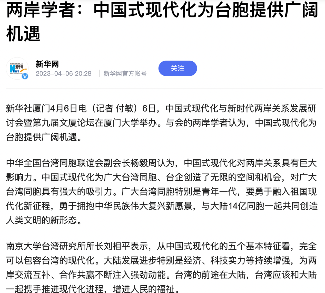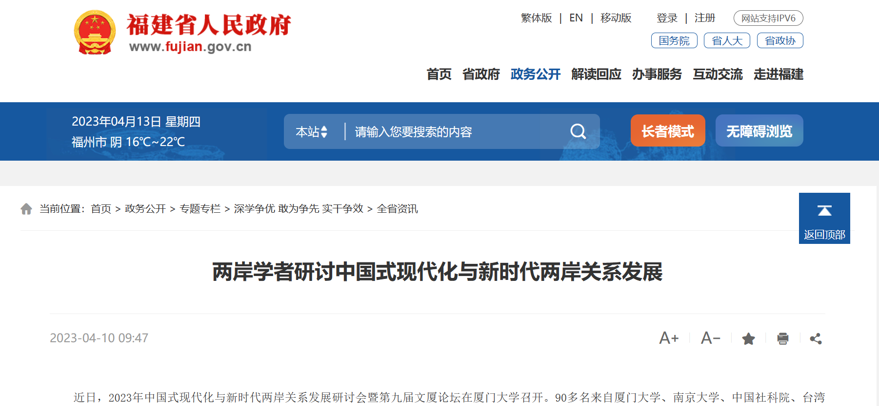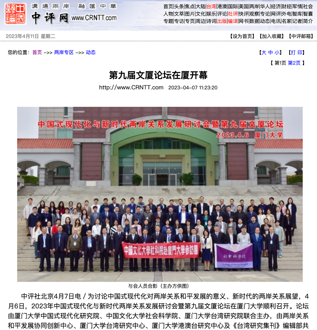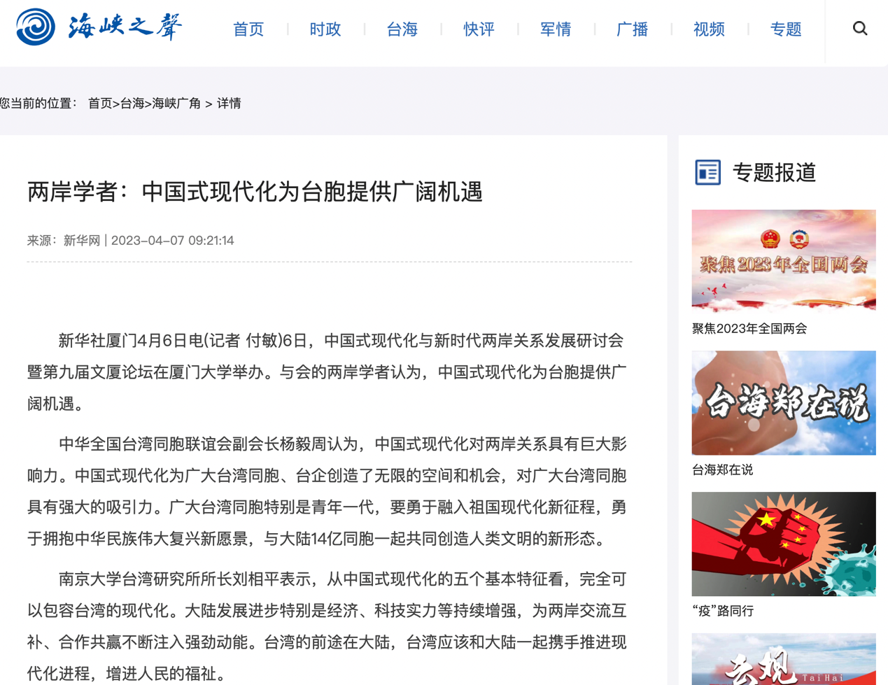 通过官方机构官网、新闻网站、报刊、电视、广播所形成的全媒体传播矩阵,第九届文厦论坛得到海峡两岸社会各界的广泛关注。截至4月11日,中国新闻网关于“两岸学界厦门研讨中国式现代化与新时代两岸关系发展”的报道浏览量已超过90次。借助此类中央重点新闻媒体网站的宣传,本届论坛的影响力节节攀升。