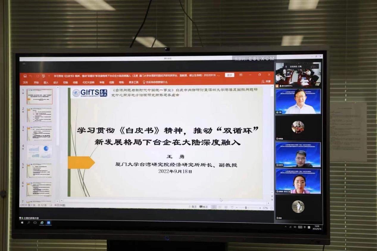 受深圳大学港澳及国际问题研究中心邀请,2022年9月18日上午,我院经济所所长王勇副教授通过线上方式参加由深圳大学社会科学部主办,深圳大学港澳及国际问题研究中心、深圳大学政府管理学院承办的《台湾问题与新时代中国统一事业》白皮书内部研讨暨深圳大学港澳及国际问题研究中心两岸地方治理研究所筹建务虚会。此次会议共有20多位来自全国各地的涉台专家学者通过线上或线下的方式参加。