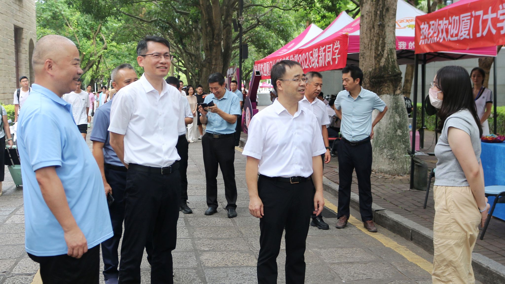 迎新期间,厦门大学校长张宗益、厦门大学党委副书记、纪委书记黄身勇等一行来到我院迎新点指导工作。校领导与正在办理注册的汪占同学亲切交流,对新生们的到来表示祝贺和欢迎,并详细询问了她来校情况。陈文副书记向校领导汇报了我院新生信息和迎新工作。院党委书记郭锦星也来到注册点,询问新生的报到情况和入学感受,对迎新工作人员和志愿者们的辛勤付出表示感谢。