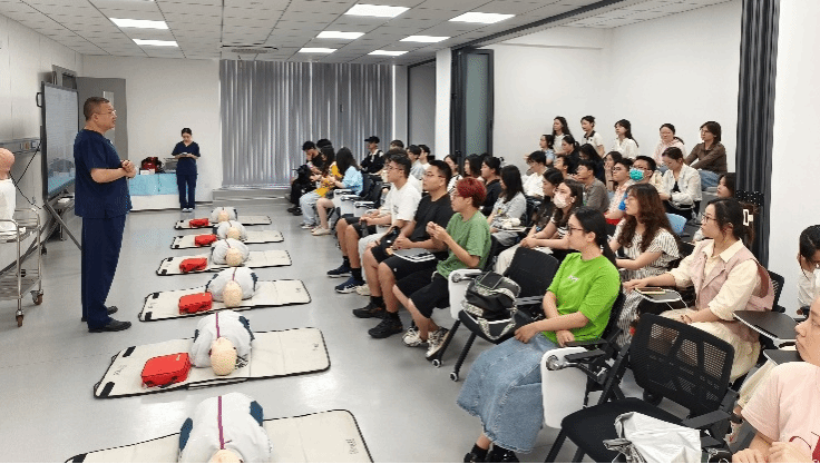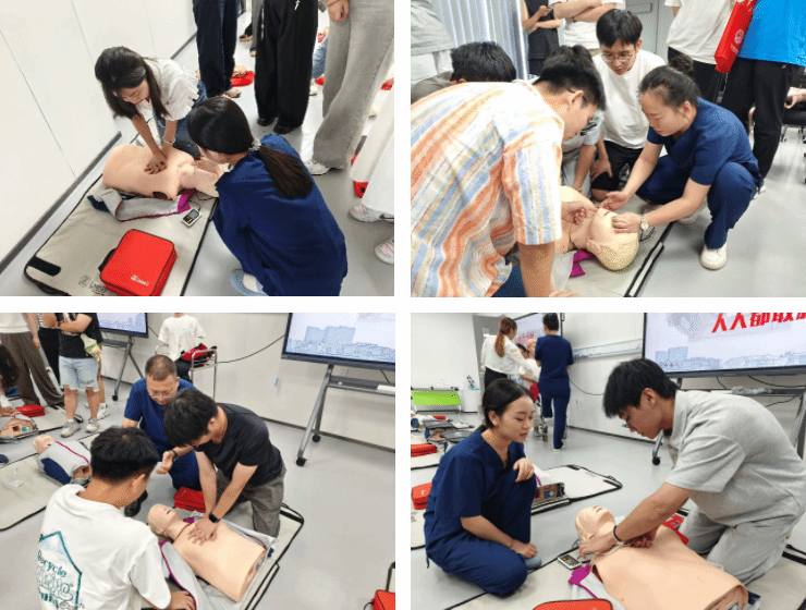培训伊始,翔安医院的姚医生为大家详细介绍了心肺复苏(CPR)的重要性。据姚医生的介绍,心脏骤停在日常生活中时有发生,而黄金抢救时间仅有短暂的4分钟。在这紧急关头,掌握心肺复苏技能的第一目击者能够极大地提高患者的生存几率。在理论讲解环节,姚医生深入剖析了心肺复苏的操作步骤、动作要领以及注意事项。他们通过生动的案例和形象的演示,让原本晦涩难懂的医学知识变得通俗易懂。同时,姚医生还介绍了自动体外除颤器(AED)的使用方法,强调了AED在急救过程中的关键作用。理论学习结束后,进入了实操演练环节。同学们在医护人员的指导下,分组使用模拟假人进行心肺复苏操作练习。从判断患者意识、呼救求助,到胸外按压、开放气道、人工呼吸,再到AED的正确使用,每一个步骤同学们都认真练习,力求做到规范准确。医护人员在一旁耐心观察,及时纠正大家的动作偏差,确保每个人都能掌握正确的急救技巧。