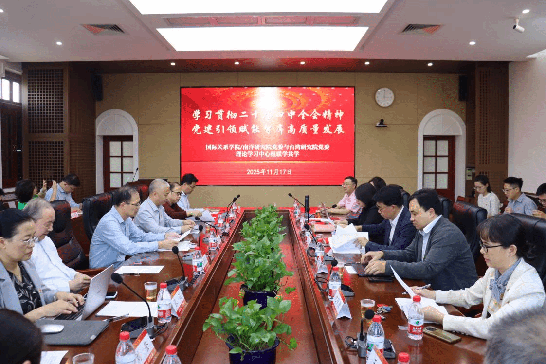 党的二十届四中全会为新时代推进国家治理体系和治理能力现代化作出了全面部署,也为高校智库立足国家战略、服务发展大局指明了前进方向。台湾研究院与国际关系学院/南洋研究院作为学校涉台问题研究、国际问题研究领域的重要智库阵地,肩负着为国家战略决策提供智力支撑、为两岸关系和平发展与区域合作贡献学术力量的重要使命。本次联学共学,以党建为纽带,搭建学科交流平台,旨在推动两院在理论学习中凝聚共识,在实践探讨中破解难题,切实把党建优势转化为智库发展优势。两院也将以此为契机,以中国东南海疆治理实验室为平台,探索新文科建设路径,推动有组织的科研,锚定国家需求,聚焦学科突破,乘势而上,以实际行动服务国家发展大局。