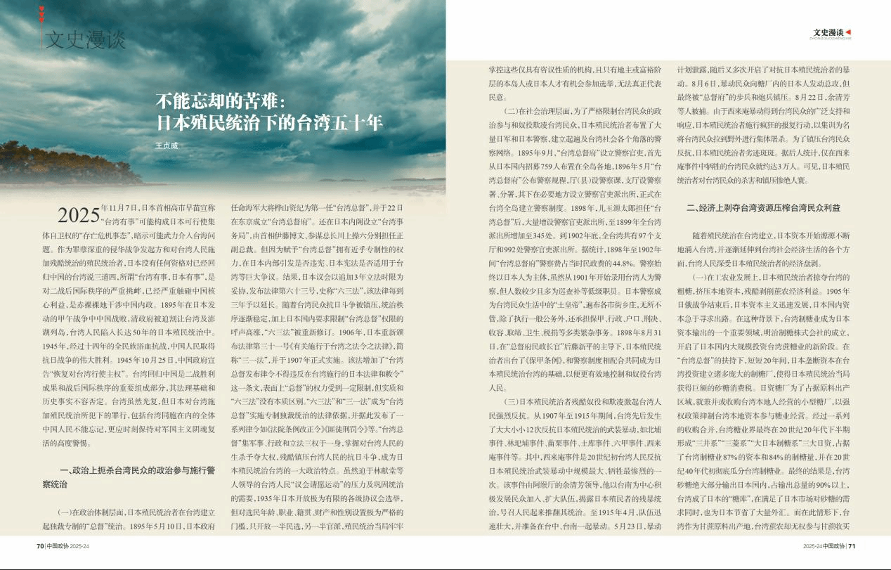 我院政治所所长王贞威在全国政协办公厅主办的《中国政协》2025年第24期刊发文章《不能忘却的苦难:日本殖民统治下的台湾五十年》。
