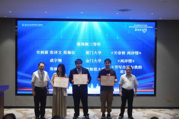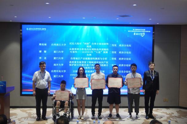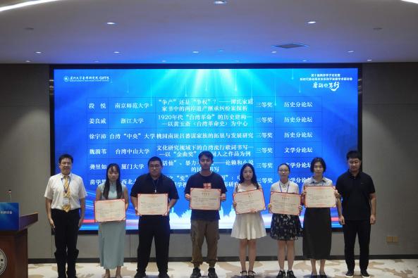 颁奖环节由院党委副书记陈文主持。各分论坛经过层层筛选,评选出了若干优秀论文和微视频作品。政治分论坛中国人民大学博士生于顺的《被“他者”支撑起的自由民主制度 ——台湾民众大陆认知对台湾民主满意度的影响分析》、经济分论坛台湾义守大学博士生撰写的《台湾半导体产业信息透明度与信任程度关系之探讨》、历史分论坛中国社会科学院大学博士生洪思音撰写的《1920年台湾地方制度改革与内地延长主义的真意》、文学分论坛厦门大学博士生陈若凡撰写的《< 文学杂志>与1950年代的台湾文学生产》、法律分论坛厦门大学硕士生林彦涛撰写的《台湾地区“防空识别区”:内涵、逻辑与制度》、两岸关系与社会分论坛福建师范大学博士生杨文军撰写的《互动仪式链视角下铸牢台湾青年共同体意识研究》以及由来自金门大学的李杭倩和杨镇豪共同创作并提交至微视频分论坛的《十载神韵》,获得了本届“两岸学子论坛”各分论坛一等奖殊荣。