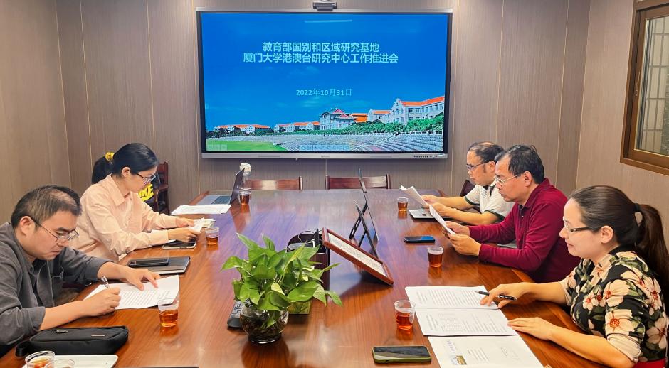 10月31日,教育部国别和区域研究基地厦门大学港澳台研究中心举行推进会,贯彻落实学校加快基地建设的有关要求,研究部署建设期间各项工作。台湾研究院院长李鹏教授、副院长张文生教授、中心主任张宝蓉教授、副主任王贞威副教授、学院秘书江诗琪、博士后杨伊婧、硕士生金睿晓参加会议。本次会议由张宝蓉教授主持。