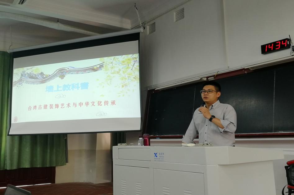 接着,吴老师介绍了台湾古建装饰艺术的表现形式。台湾的古建装饰艺术工艺大多师承于福建、广东地区,在文化上传承了中国传统文化,其中受客家文化的影响较大。在台系古建装饰艺术中,建筑的大门至关重要,“三川门”是南系建筑中十分有特色的的大门样式,门类充满了各种建筑装饰艺术,显得尤为繁复华丽,并从柱、墙、门等方面展开详细介绍。吴教授认为台湾古建装饰艺术注重社会教化,诸子摆件学说都浓缩在那些石雕、木雕、转刻、泥塑、彩绘、交趾、剪粘的艺术精品之中,是中国传统文化的墙上历史教科书。