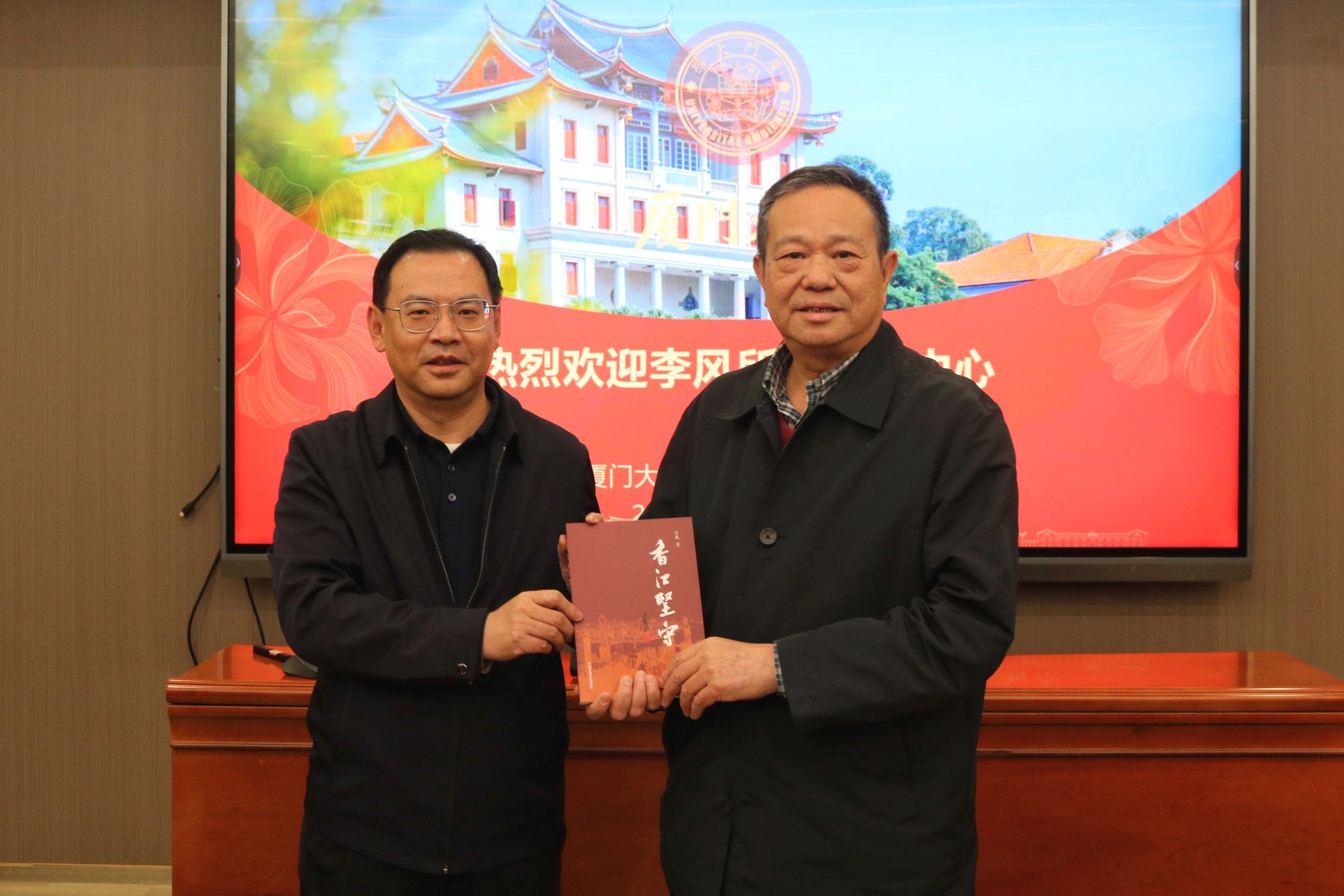 讲座伊始,李风所长介绍了他与厦门大学台湾研究院之间深厚的渊源。他回顾了多年来与台湾研究院在学术交流等方面的紧密联系,情真意切,令人动容。随后,他向港澳台研究中心赠送了自己的学术著作,双方举行了简短而隆重的赠书仪式。