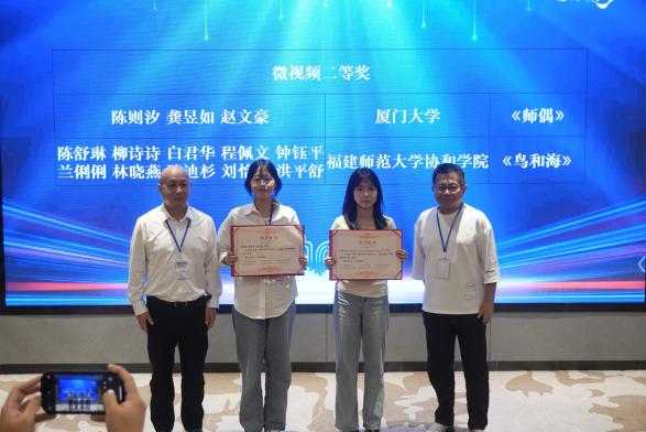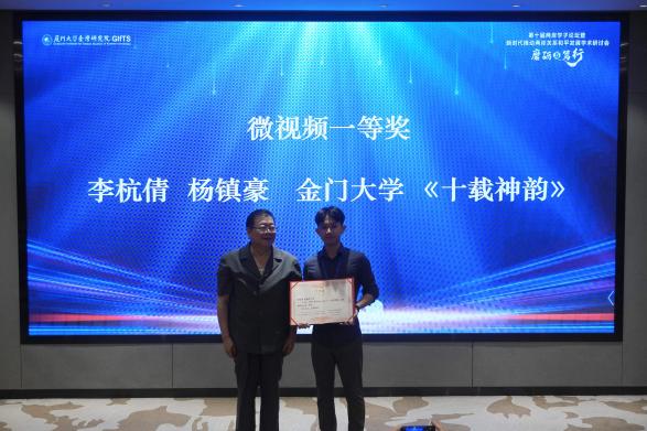 颁奖环节由院党委副书记陈文主持。各分论坛经过层层筛选,评选出了若干优秀论文和微视频作品。政治分论坛中国人民大学博士生于顺的《被“他者”支撑起的自由民主制度 ——台湾民众大陆认知对台湾民主满意度的影响分析》、经济分论坛台湾义守大学博士生撰写的《台湾半导体产业信息透明度与信任程度关系之探讨》、历史分论坛中国社会科学院大学博士生洪思音撰写的《1920年台湾地方制度改革与内地延长主义的真意》、文学分论坛厦门大学博士生陈若凡撰写的《< 文学杂志>与1950年代的台湾文学生产》、法律分论坛厦门大学硕士生林彦涛撰写的《台湾地区“防空识别区”:内涵、逻辑与制度》、两岸关系与社会分论坛福建师范大学博士生杨文军撰写的《互动仪式链视角下铸牢台湾青年共同体意识研究》以及由来自金门大学的李杭倩和杨镇豪共同创作并提交至微视频分论坛的《十载神韵》,获得了本届“两岸学子论坛”各分论坛一等奖殊荣。
