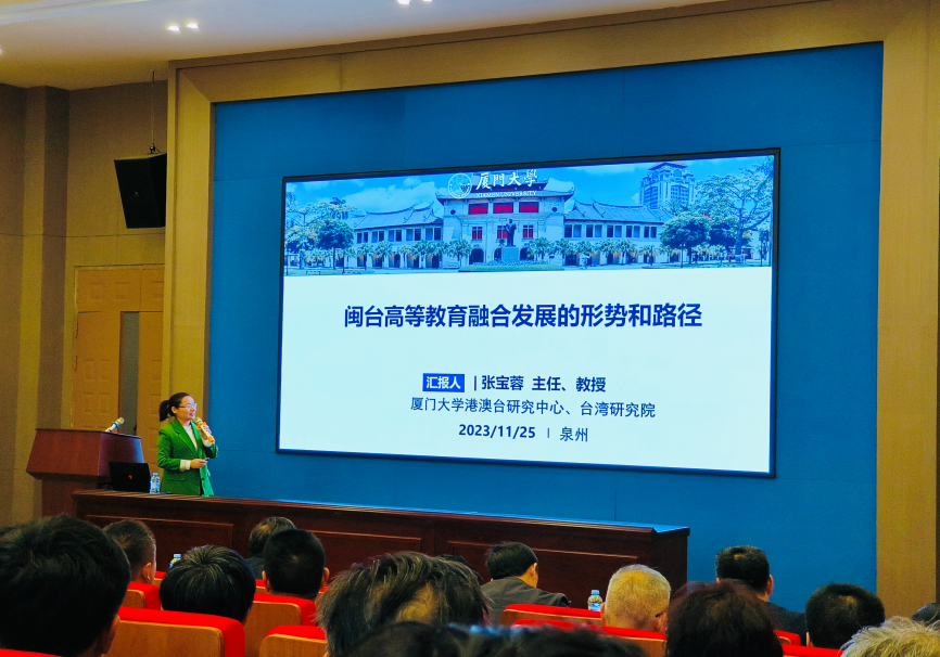 11月25日,厦门大学港澳台研究中心主任张宝蓉教授应邀出席福建省高等教育学会2023年工作会议,并作题为“闽台高等教育融合发展的形势与路径”专题报告,福建省高等教育学会副会长王伟宜教授主持。