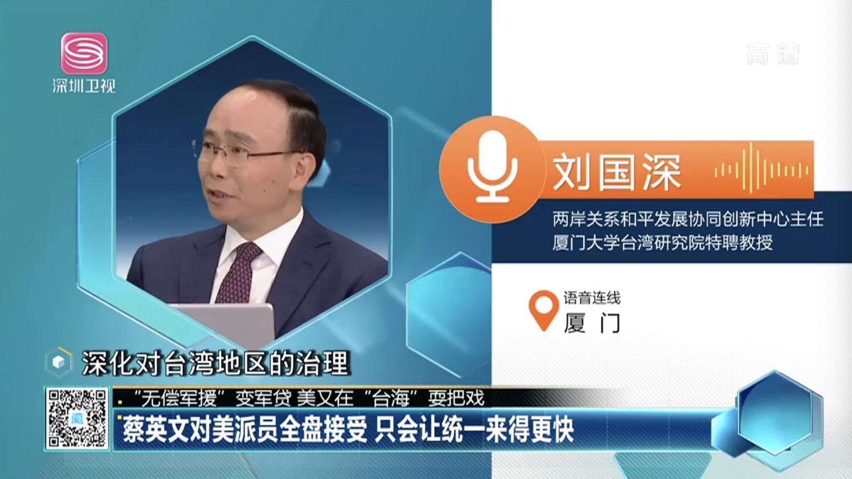 近日,两岸关系和平发展协同创新中心主任、厦门大学台湾研究院特聘教授刘国深就“美方欲机制化派公务人员窜台”等相关话题接受深圳卫视《决胜制高点》节目的电话连线采访。