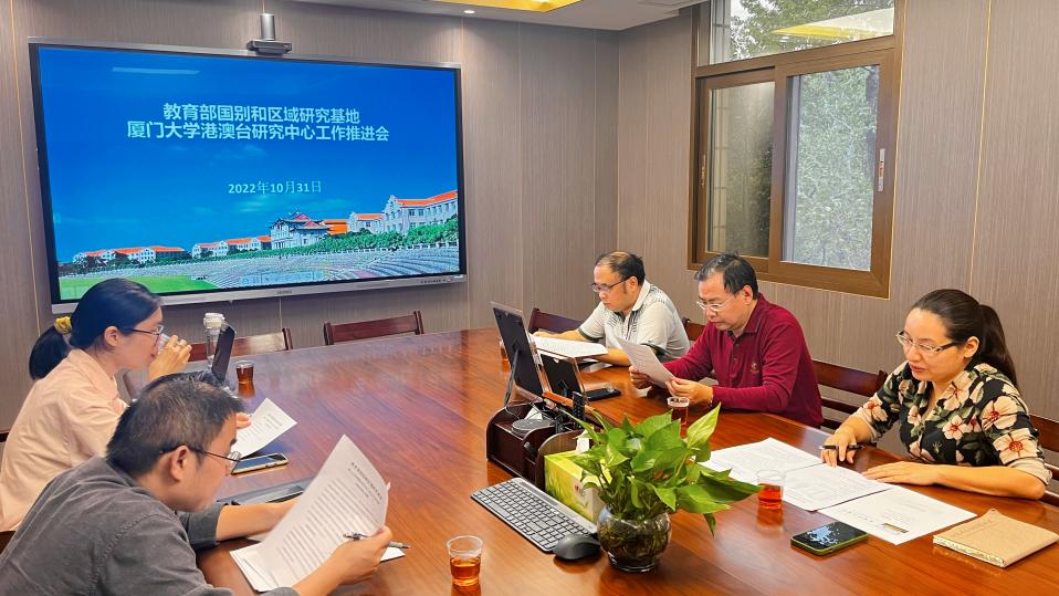 10月31日,教育部国别和区域研究基地厦门大学港澳台研究中心举行推进会,贯彻落实学校加快基地建设的有关要求,研究部署建设期间各项工作。台湾研究院院长李鹏教授、副院长张文生教授、中心主任张宝蓉教授、副主任王贞威副教授、学院秘书江诗琪、博士后杨伊婧、硕士生金睿晓参加会议。本次会议由张宝蓉教授主持。