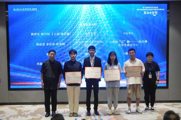 颁奖环节由院党委副书记陈文主持。各分论坛经过层层筛选,评选出了若干优秀论文和微视频作品。政治分论坛中国人民大学博士生于顺的《被“他者”支撑起的自由民主制度 ——台湾民众大陆认知对台湾民主满意度的影响分析》、经济分论坛台湾义守大学博士生撰写的《台湾半导体产业信息透明度与信任程度关系之探讨》、历史分论坛中国社会科学院大学博士生洪思音撰写的《1920年台湾地方制度改革与内地延长主义的真意》、文学分论坛厦门大学博士生陈若凡撰写的《< 文学杂志>与1950年代的台湾文学生产》、法律分论坛厦门大学硕士生林彦涛撰写的《台湾地区“防空识别区”:内涵、逻辑与制度》、两岸关系与社会分论坛福建师范大学博士生杨文军撰写的《互动仪式链视角下铸牢台湾青年共同体意识研究》以及由来自金门大学的李杭倩和杨镇豪共同创作并提交至微视频分论坛的《十载神韵》,获得了本届“两岸学子论坛”各分论坛一等奖殊荣。