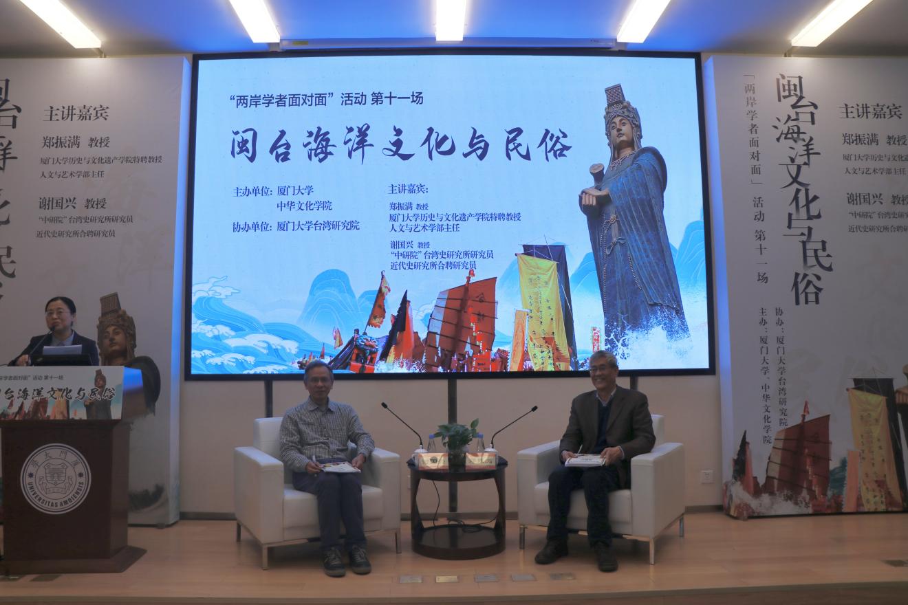 2024年1月4日,第十一场“两岸学者面对面”系列学术活动在厦门大学科学艺术中心举办,主题为“闽台海洋文化与民俗”。本场活动由厦门大学和中华文化学院共同主办,厦门大学台湾研究院承办,特别邀请了厦门大学人文与艺术学部主任、历史与文化遗产学院特聘教授郑振满和“中研院”台湾史研究所研究员、近代史研究所合聘研究员谢国兴展开对谈。