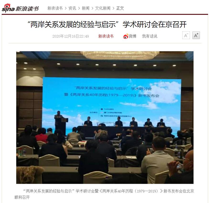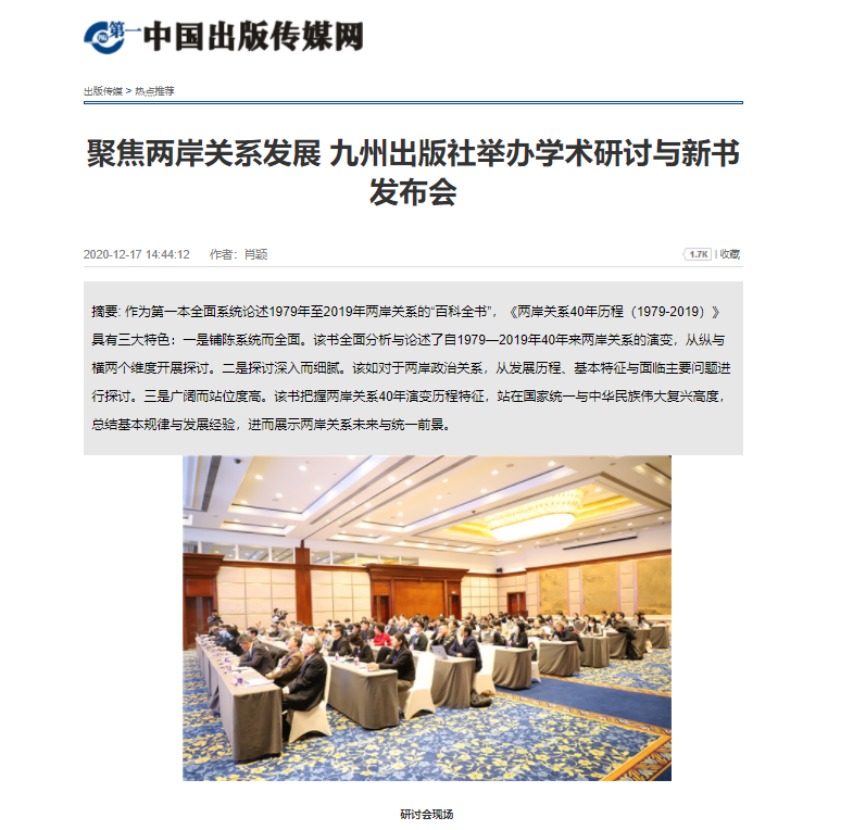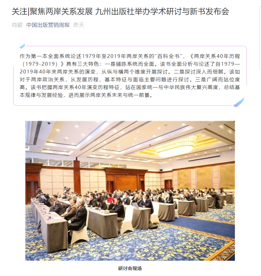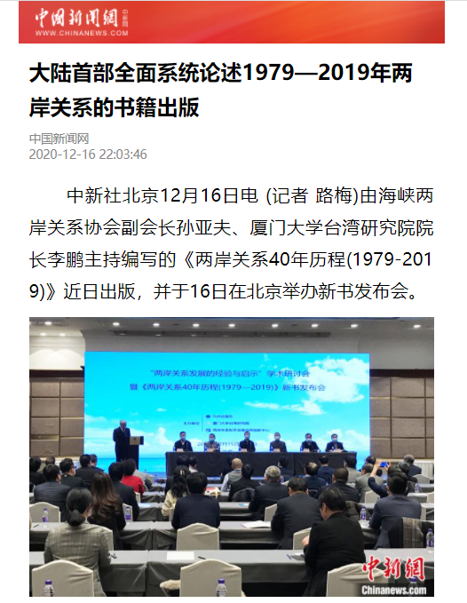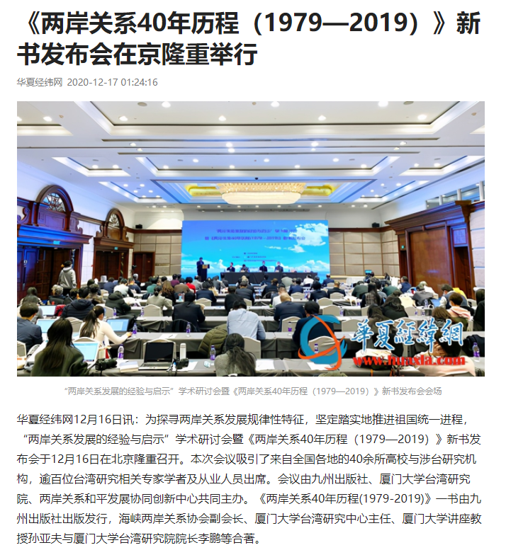 12月16日,为探寻两岸关系发展规律性特征,坚定踏实地推进祖国统一进程,“两岸关系发展的经验与启示”学术研讨会暨《两岸关系40年历程(1979—2019)》新书发布会在北京顺利召开。本次会议吸引了来自全国各地的40余所高校与涉台研究机构,逾百位台湾研究相关专家学者及从业人员出席。会议由九州出版社、厦门大学台湾研究院、两岸关系和平发展协同创新中心共同主办。《两岸关系40年历程(1979-2019)》一书由九州出版社出版发行,海峡两岸关系协会副会长、厦门大学台湾研究中心主任、厦门大学讲座教授孙亚夫与厦门大学台湾研究院院长李鹏等合著。