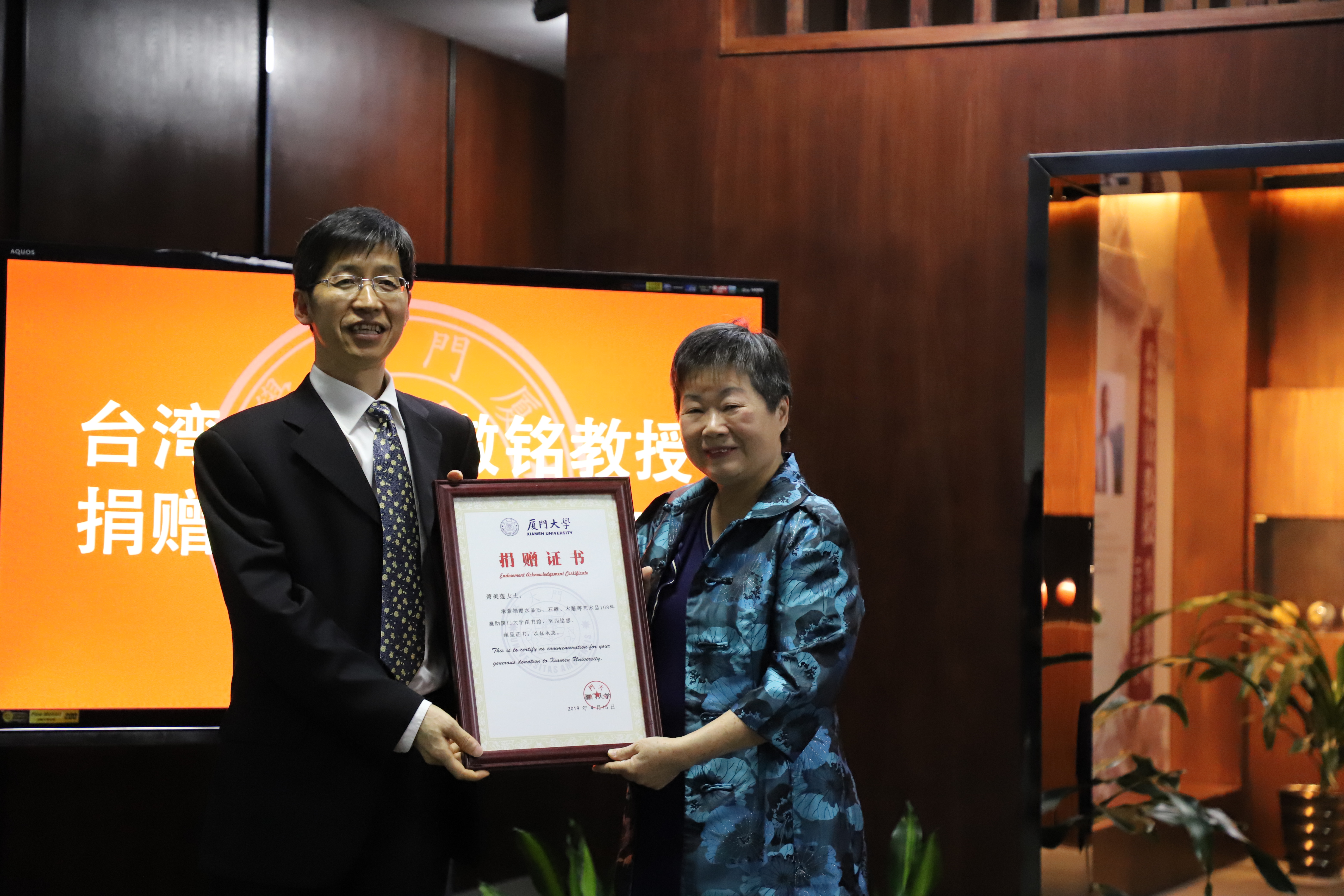 台湾大学教授蔡墩铭是台湾著名的刑法学家。他勤于著书立说、传道授业,又深入社会、践行法制。他也是两岸法学学术交流的先行者,早于上世纪90年代初,就多次受邀请到大陆访问交流,其著作学说在大陆广为流传。蔡墩铭因病辞世后,为弘扬他的学术与理念,萧美莲决定将蔡墩铭生前的所有藏书2617册,档案资料1156件(含剪报资料、手稿、书信、证书、照片等)和个人收藏的艺术品108件捐赠给厦门大学。这批学术资料丰富了厦门大学图书馆的法学馆藏,为研究台湾法学发展进程、推动两岸关系和平发展提供了文献支持。