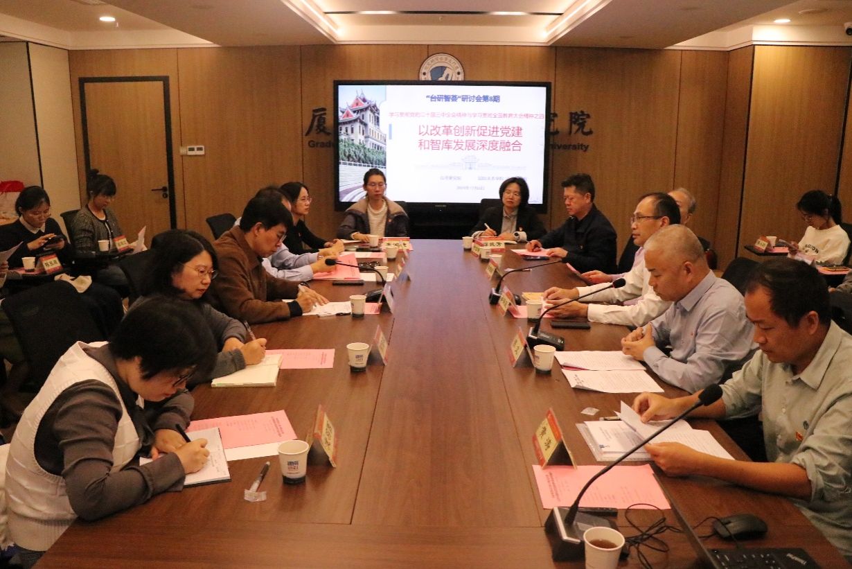 为深入贯彻落实党的二十届三中全会精神与全国教育大会精神,以创新赋能特色新型智库建设,12月6日下午,在台湾研究院西村会议室,台湾研究院与国际关系学院/南洋研究院联合举办党建和事业发展深度融合主题研讨会。厦门大学基层党建工作联络员白锡能老师、谢银辉老师到场指导,会议由台湾研究院党委副书记陈文主持。