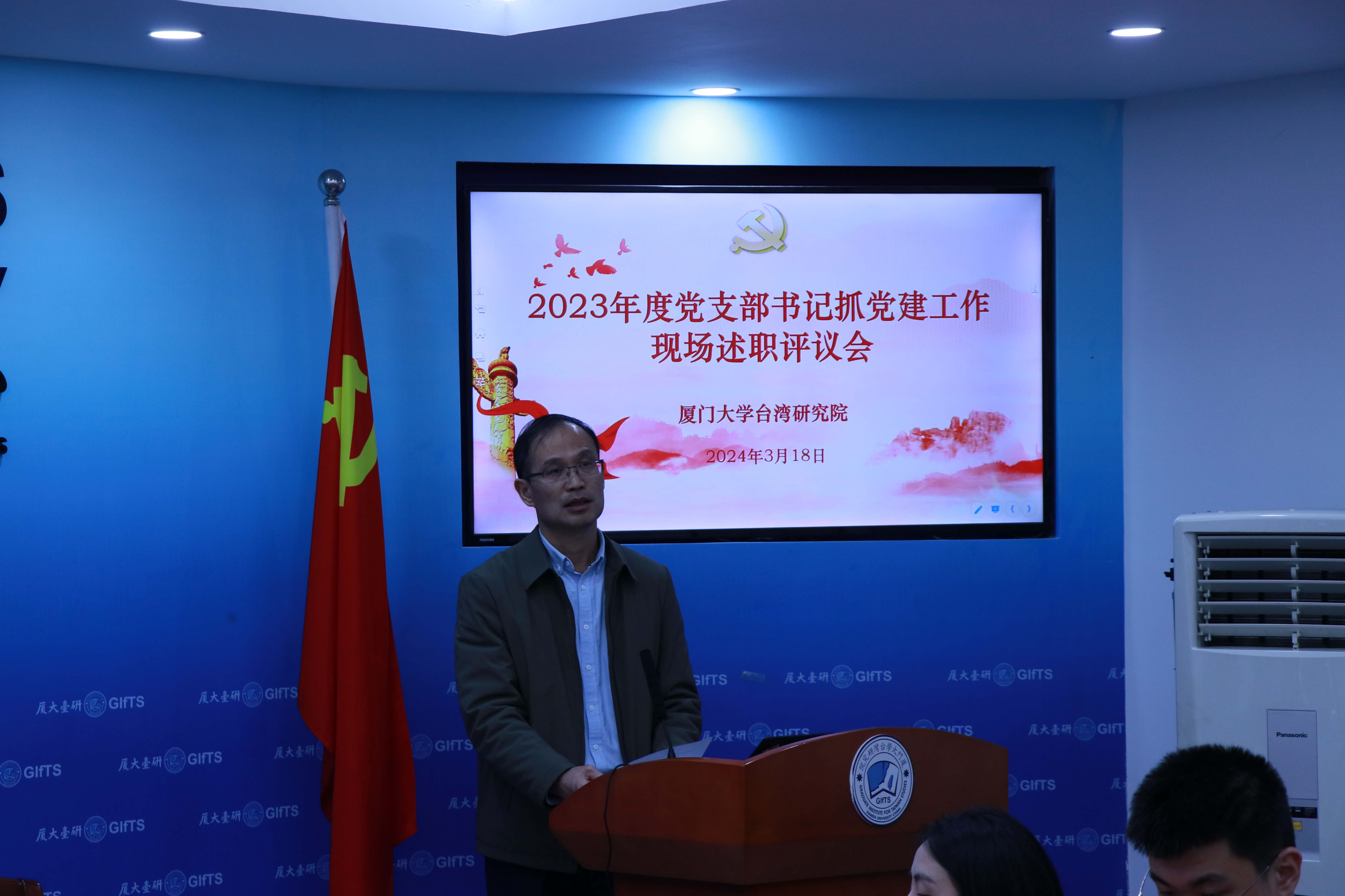 为进一步压紧压实各级党组织书记抓基层党建第一责任人责任,落实全面从严治党政治责任,提升基层党建工作质量,根据校党委组织部工作部署,3月18日下午,台湾研究院在院507会议室召开2023年度党支部书记抓党建工作现场述职评议会。本次述职评议会由院党委陈文副书记主持,院党委委员、各党支部书记、支委代表参加会议,校基层党建工作联络员白锡能、校学生工作部(处)副部长陈泗林列席会议,院党委书记郭锦星作总结发言。