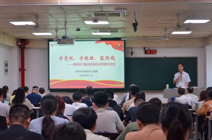 为深入学习贯彻习近平总书记关于党纪学习教育的重要讲话和重要指示精神,推动党纪学习教育取得实实在在成效,6月11日下午,台湾研究院党委书记郭锦星以“学党纪、守规矩、筑防线——做新时代廉洁修身的优秀青年党员”为题,讲授专题党课。校基层党建联络员白锡能、院党委副书记陈文以及全院学生党员、入党积极分子、全体毕业班同学参加,报告会由院团委书记陈静娴主持。