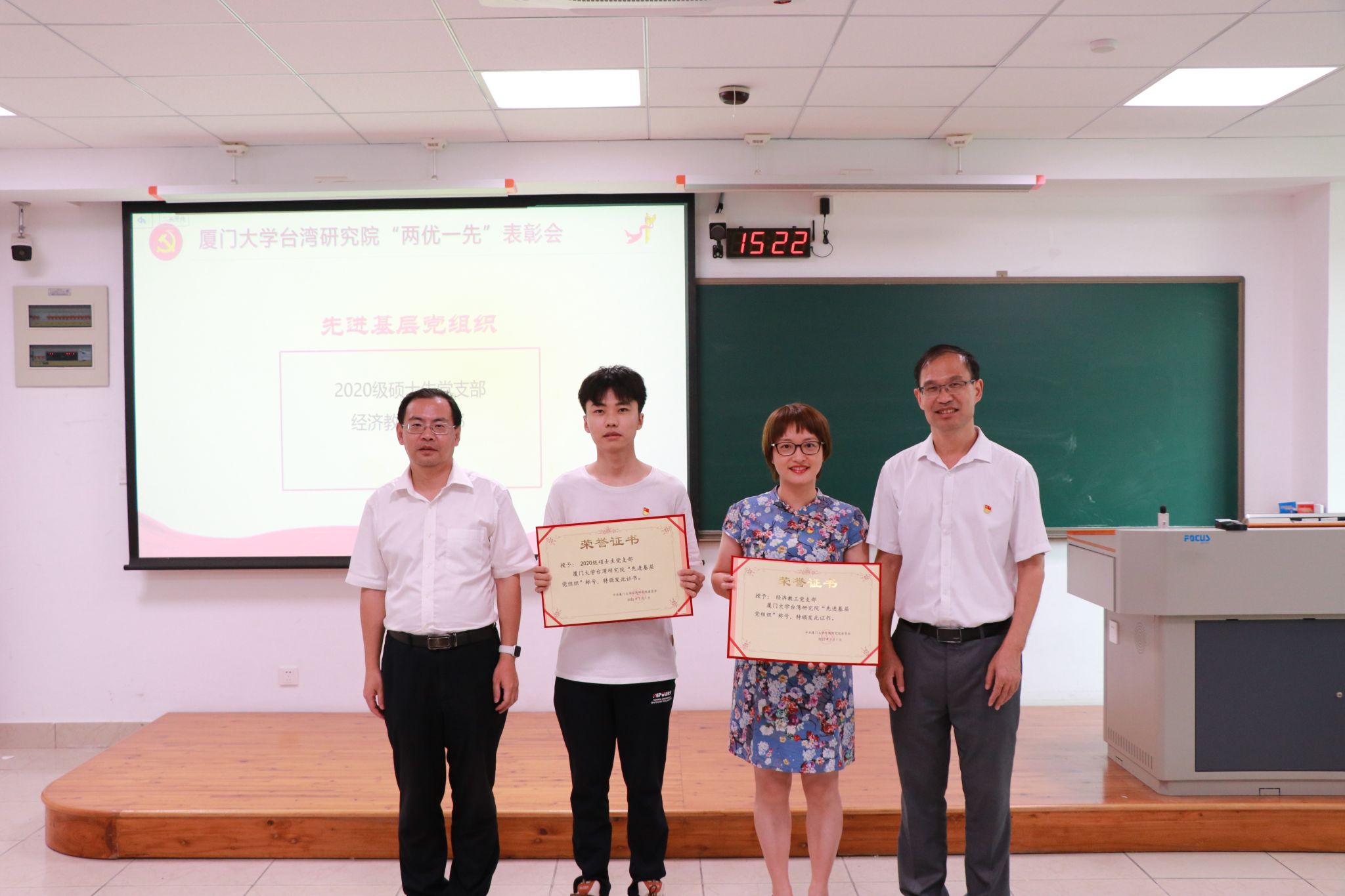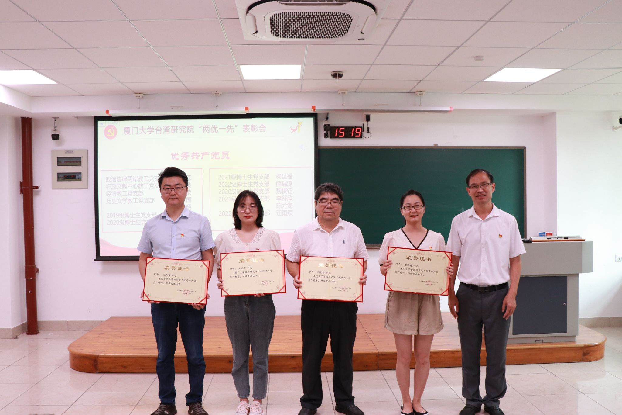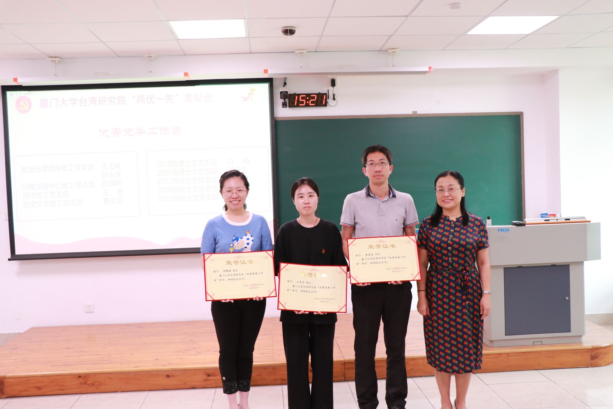 会议表彰了台湾研究院 2022~2023 年优秀共产党员、优秀党务工作者和先进基层党组织。李鹏院长宣读《关于表彰厦门大学台湾研究院优秀共产党员、优秀党务工作者和先进基层党组织的决定》。李鹏院长表示,这一次表彰的优秀个人和先进集体,是研究院共产党员、党务工作者和基层党组织中的突出代表,他们的先进事迹和良好表现,彰显了我们党的性质和宗旨。李院长号召研究院各党支部和全体党员要以受表彰的群体、集体和个人为榜样,坚持以习近平新时代中国特色社会主义思想为指导,全面贯彻落实习近平总书记致厦门大学建校100周年重要贺信精神,在今后的工作中砥砺奋进,再创佳绩,为祖国和平统一事业努力奋斗!