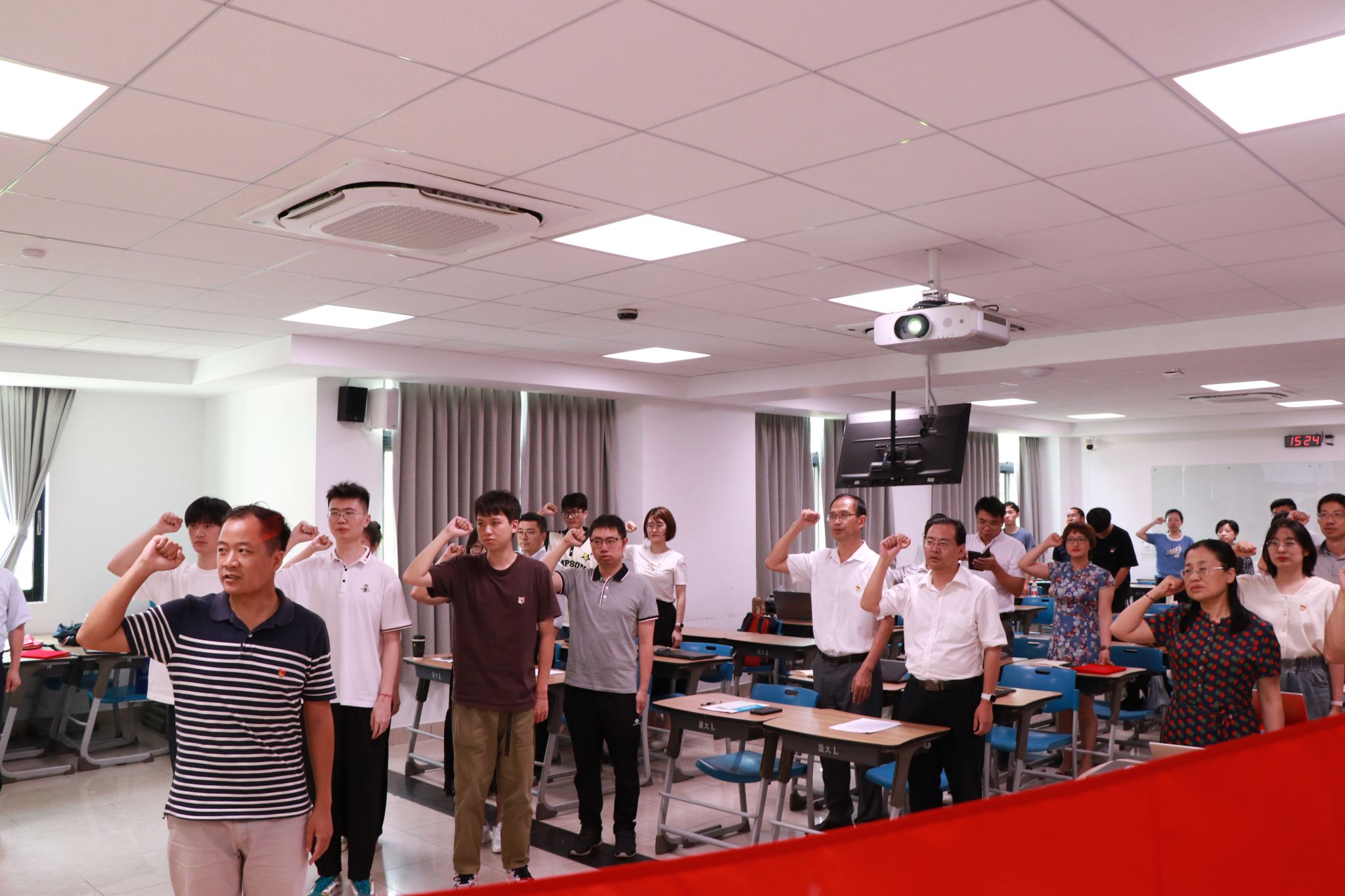 会议还举行了新党员入党宣誓仪式。老党员与全体新党员一起,在团委书记黄涛老师的带领下面向党旗庄严宣誓,重温入党誓词。