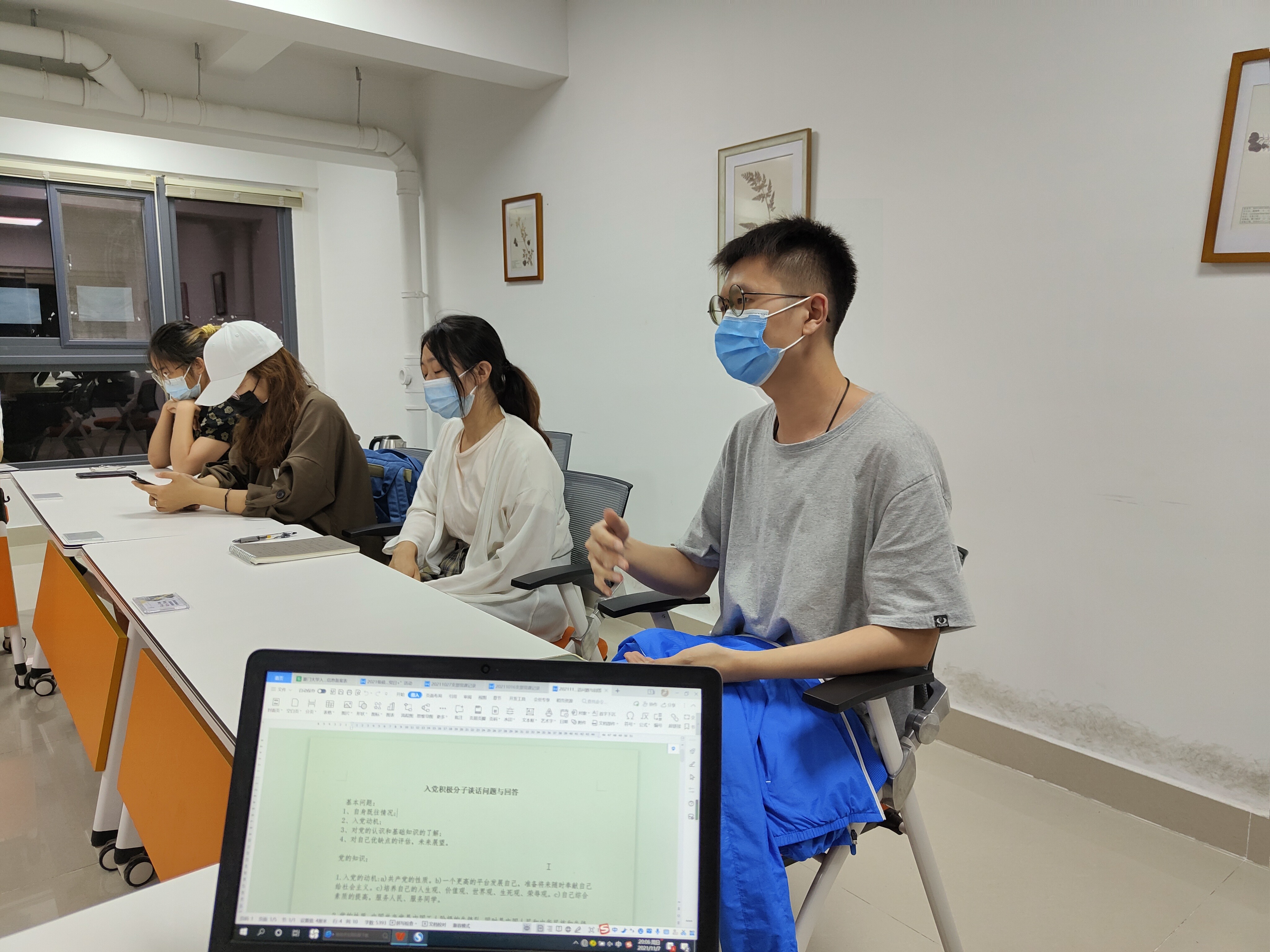 在谈话会正式开始之前,2021级硕士生班的发展对象吴宜泽首先就自己被确定为发展对象谈了自己的体会,他说入党实际上是一个漫长的过程,充满了考验与磨砺,我们应时刻铭记入党的纯洁初心,去芜存菁,让我们的思想不断接近那些优秀的中国共产党党员,以他们为榜样,在学习、工作、生活之中发扬先锋精神,甘于奉献,甘于沉淀,脚踏实地地在各自的领域做出成绩。