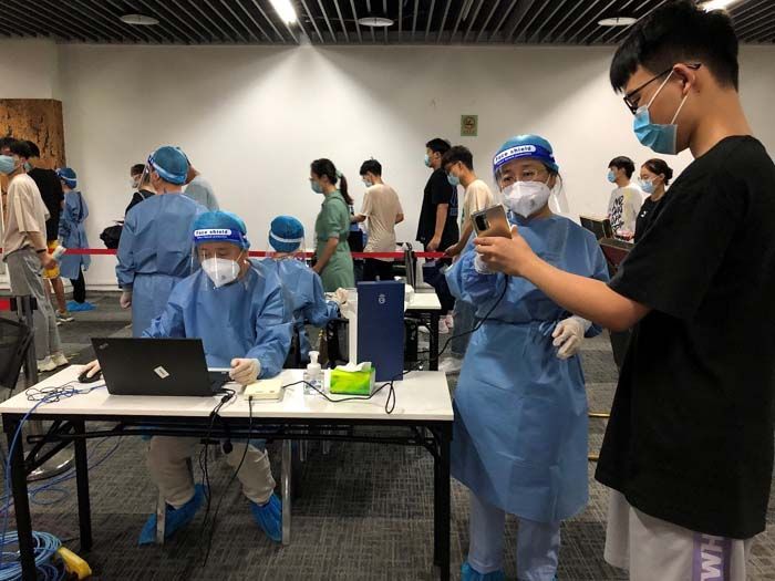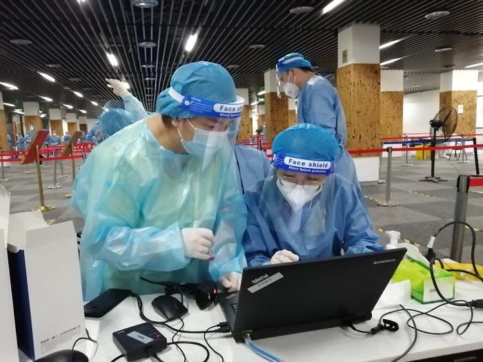 当日12时整,穿上蓝色防护服、戴上隔离面罩后,我院教师志愿者在第17至20检测小组展开了有条不紊的工作,维护现场秩序、录入核对信息、引导师生离开检测点,4小时协助医护人员完成了近2000名师生的核酸采样。