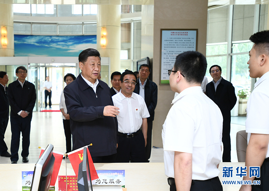 7月15日至16日,中共中央总书记、国家主席、中央军委主席习近平在内蒙古考察并指导开展“不忘初心、牢记使命”主题教育。这是16日上午,习近平在内蒙古自治区自然资源厅自然资源政务大厅同工作人员交谈,了解开展主题教育和落实便捷高效政务服务等情况。 新华社记者 谢环驰 摄