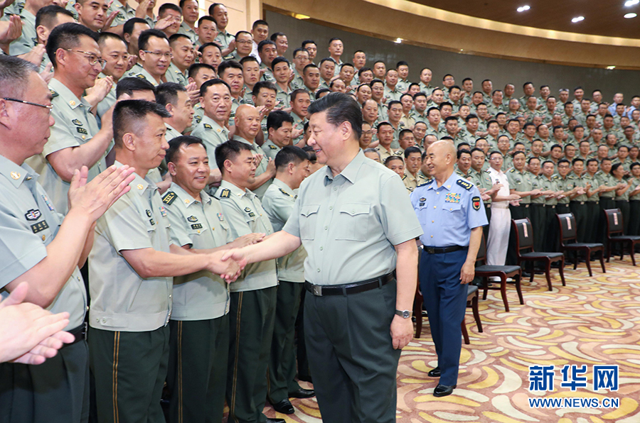 7月15日至16日,中共中央总书记、国家主席、中央军委主席习近平在内蒙古考察并指导开展“不忘初心、牢记使命”主题教育。这是16日上午,习近平在呼和浩特亲切接见驻内蒙古部队副师职以上领导干部和团级单位主官,代表党中央和中央军委向驻内蒙古部队全体官兵致以诚挚问候。 新华社记者 李刚 摄