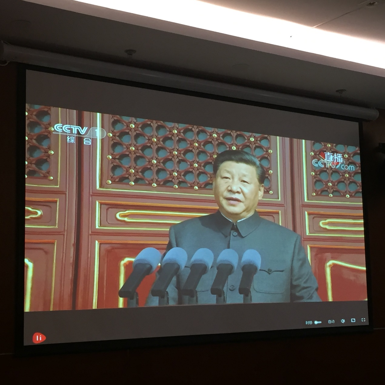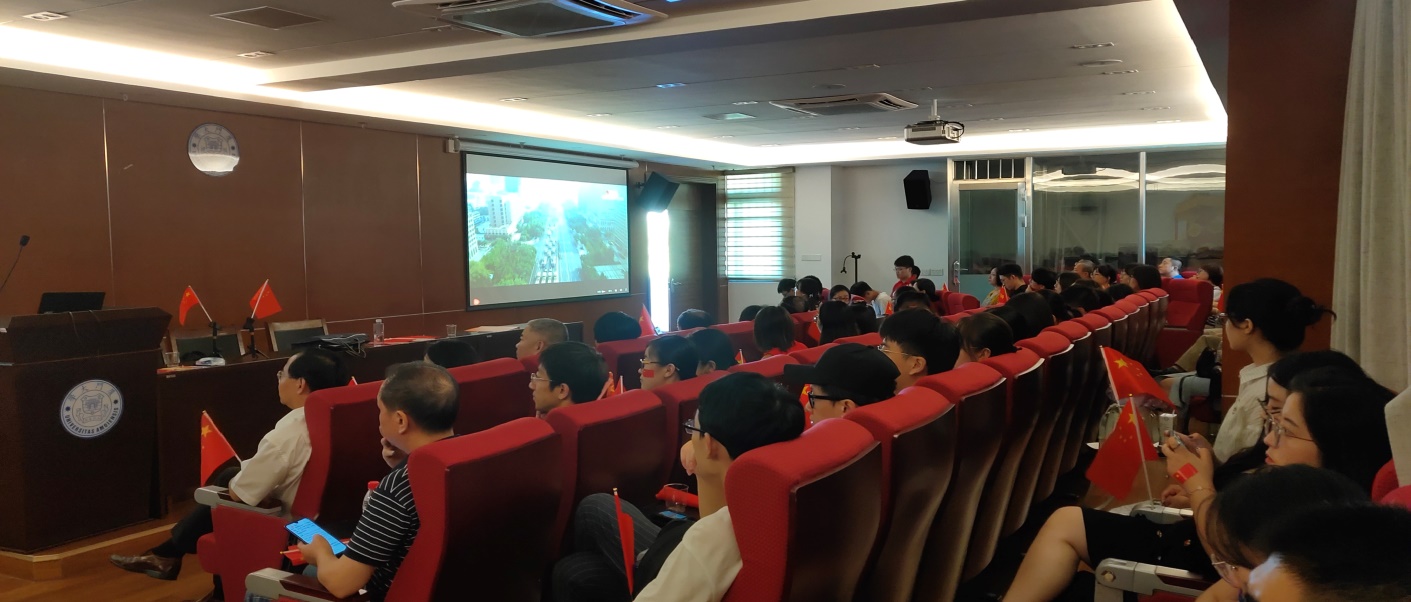 10月1日上午10时,庆祝中华人民共和国成立七十周年大会在北京天安门广场隆重举行。厦门大学台湾研究院师生集中于嘉庚420教室全程收看大会直播盛况。曾坤瑜书记、李鹏院长、刘国深主任、陈文副书记、彭莉副院长、张羽副院长、张文生副院长等院党政主要领导参加收看。