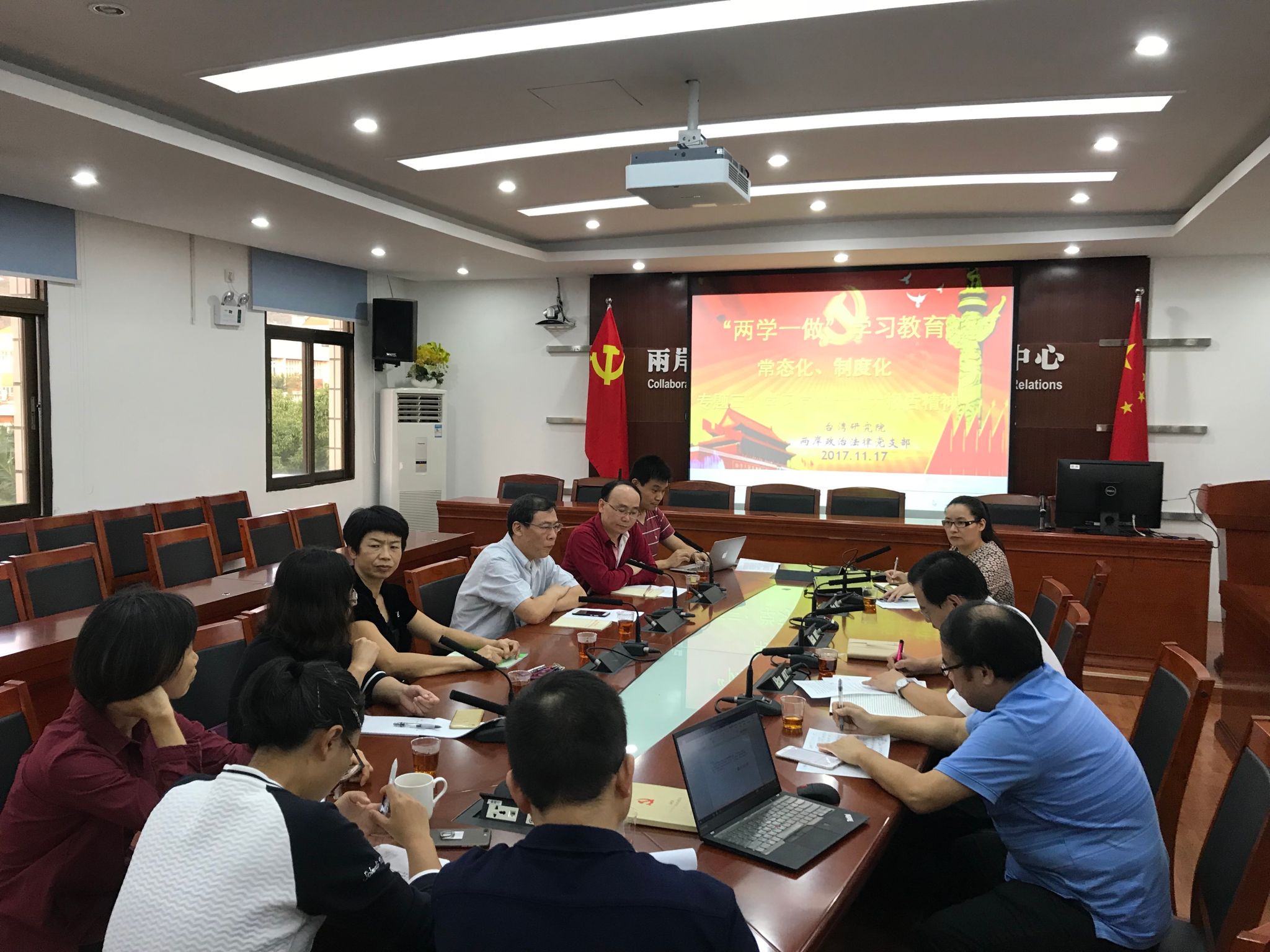 根据学校 “两学一做”学习教育常态化、制度化的部署和要求,在院党委指导下,为了提高学习成效,在前阶段个人学习基础上,台湾研究院两岸政治法律党支部于2017年11月17日在院5楼大会议室召开专题三集中学习活动。本次学习主要内容为深刻学习领会党的十九大精神,特别是习近平新时代中国特色社会主义思想。李建发副校长、副书记、台湾研究院党委成员,以及本支部教工党员共同出席参加此次学习活动。院党委曾坤瑜书记主持此次学习活动。