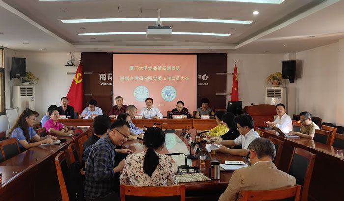 根据校党委的统一部署,2018年11月5日下午,中共厦门大学委员会第四巡察组巡察台湾研究院工作动员会在台湾研究院507会议室召开。第四巡察组组长郑建华,副组长高和荣、曾安,巡察办副主任洪真裁,巡察组成员王洁松、王晓丽、洪少丹,联络员沈辛毅出席了大会。研究院党委书记曾坤瑜、副书记李鹏院长、陈文,副院长张文生、彭莉、张羽,研究院全体在职教职工及部分离退休教师代表参加了会议。会议由台湾研究院党委书记曾坤瑜主持。