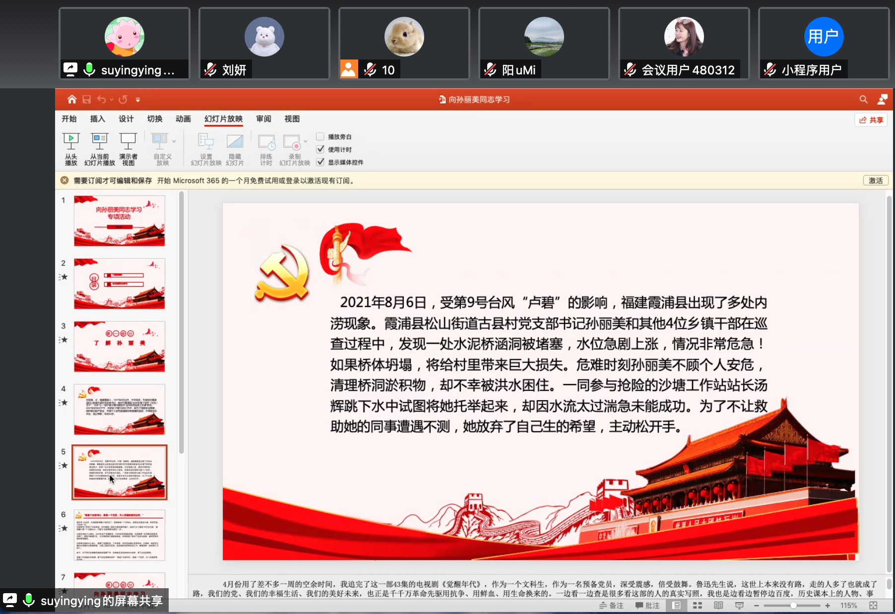 首先,蔡艺玲同志向大家介绍了孙丽美同志的生平。孙丽美同志生前担任福建霞浦县松山街道古县村党支部书记,2021年8月6日下午,在防抗“卢碧”台风工作中,她为了排除安全隐患,保护群众财产安全,不顾个人安危疏通被杂物堵塞的涵洞,不幸被洪水冲走,因公殉职,年仅44岁。孙丽美同志是新时代共产党人的楷模,是基层干部一心为民、真情服务的典范。蔡艺玲同志认为,我们不仅需要向孙丽美同志学习对党忠诚、勇担使命的政治品质和坚守初心、践行宗旨的为民情怀,还要学习她克己奉公、无私奉献的高尚情操和实干担当、攻坚克难的务实作风。