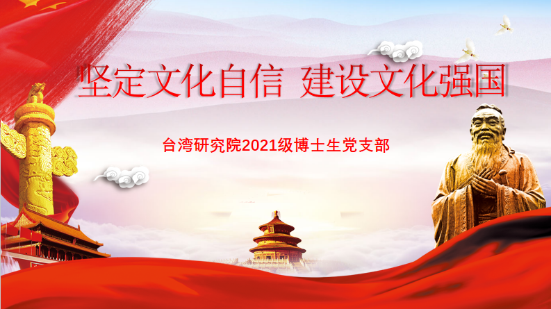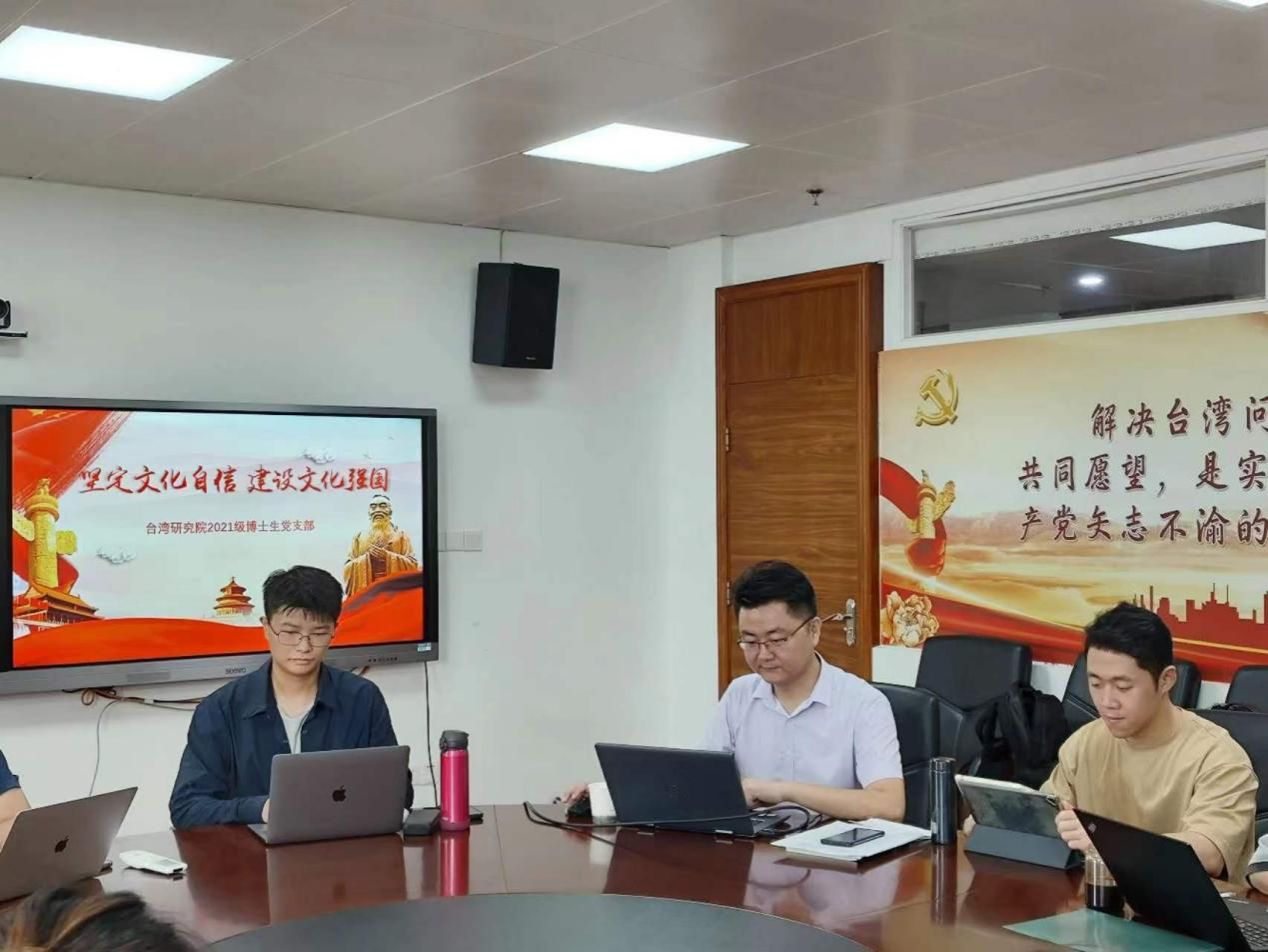 10月10日下午,厦大台湾研究院2021级博士生党支部在厦大嘉庚四418会议室开展以“坚定文化自信 建设文化强国”为主题的“固定党日+”活动。