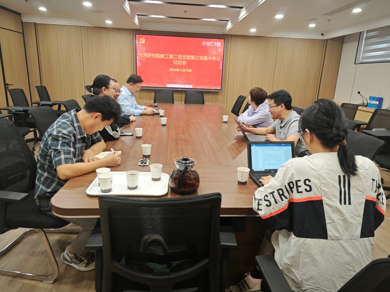 2024年11月18日下午,台湾研究院教工第二党支部在西村会议室举办2024年第三场集中学习讨论会,议题为深入学习贯彻习近平总书记关于全面深化改革的一系列新思想、新观点、新论断和党的二十届三中全会精神,讨论会由支部书记王勇主持,支部宣传委员廖芸英,支部成员王华、唐桦、肖日葵、黄燕萍、艾民伟参加会议。