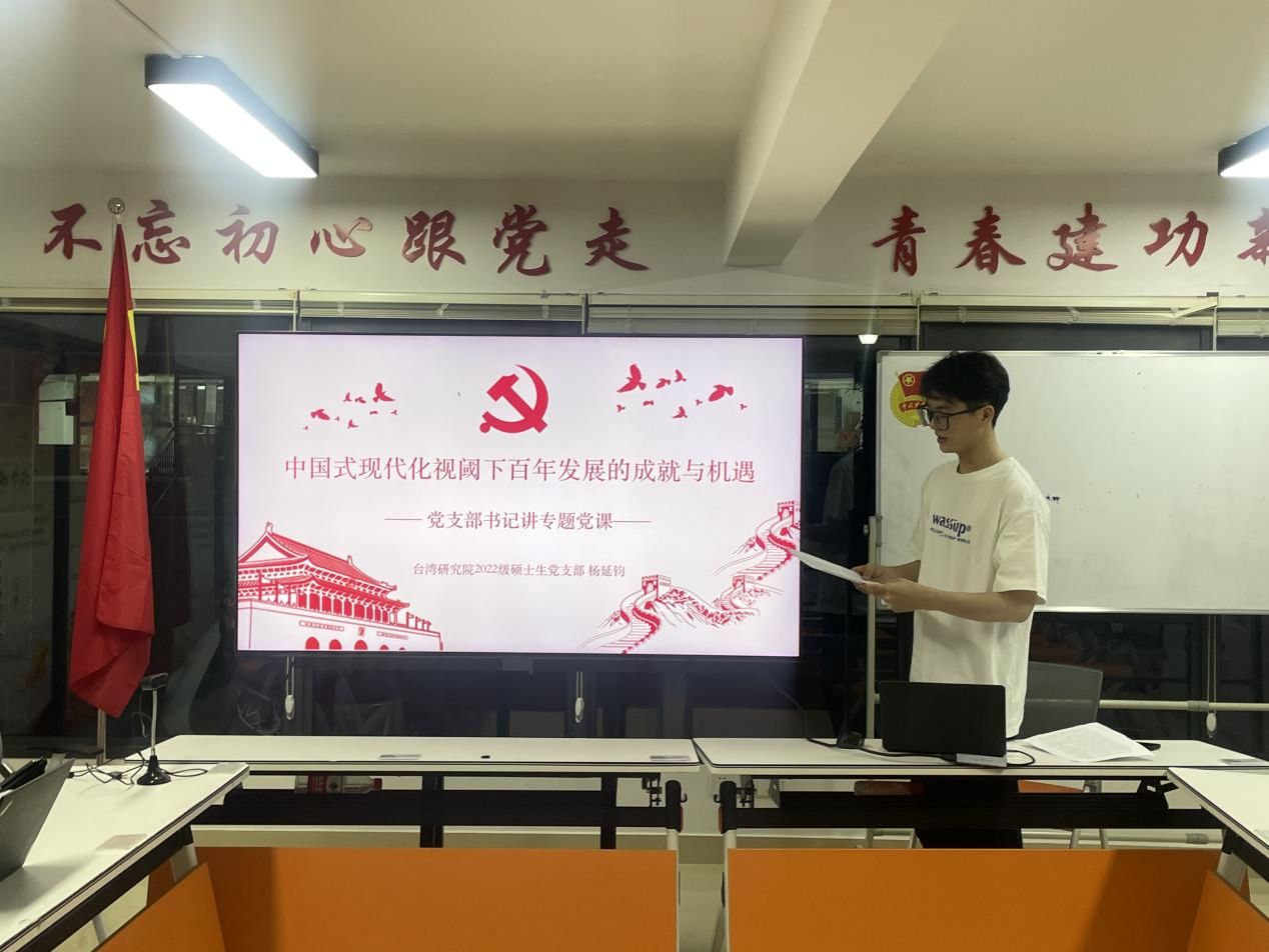 首先,党支部书记杨延钧同志以“中国式现代化视阈下百年发展的成就与机遇”为主题,向支部党员讲授专题党课。他从中国式现代化发展的视角切入,针对祖国长期发展过程中所开创的“中国模式”展开讲述,围绕发展模式的国际比较、阶段性成就、百年变局的挑战机遇以及青年的历史责任与使命等内容,与支部党员们共同分享心得体会。