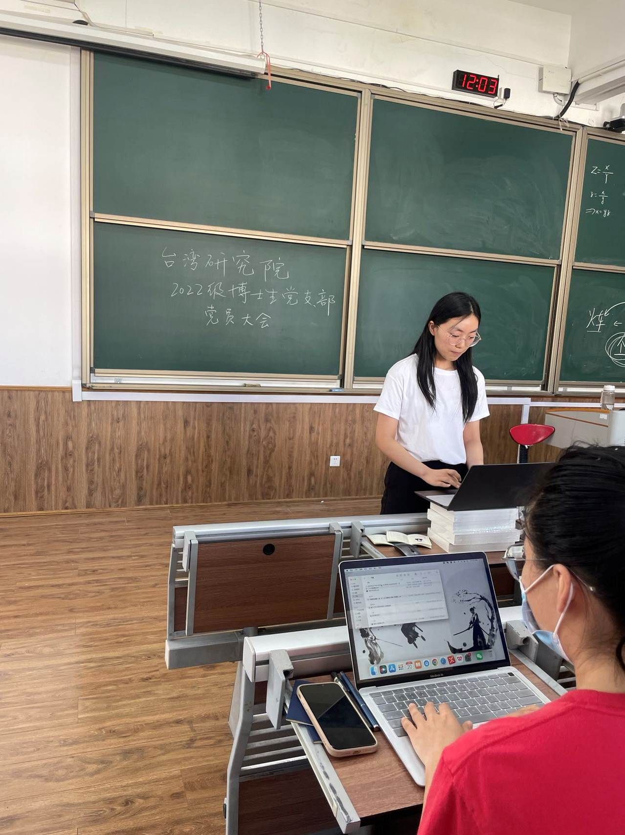 党支部书记陈敏同学首先介绍了大会主题,并强调党的二十大是在全党全国各族人民迈上全面建设社会主义现代化国家新征程、向第二个百年奋斗目标进军的关键时刻召开的一次十分重要的大会。之后,她简要介绍了报告的十五个章节的主要内容,并带领支部党员集体学习了二十大报告中的涉台内容。