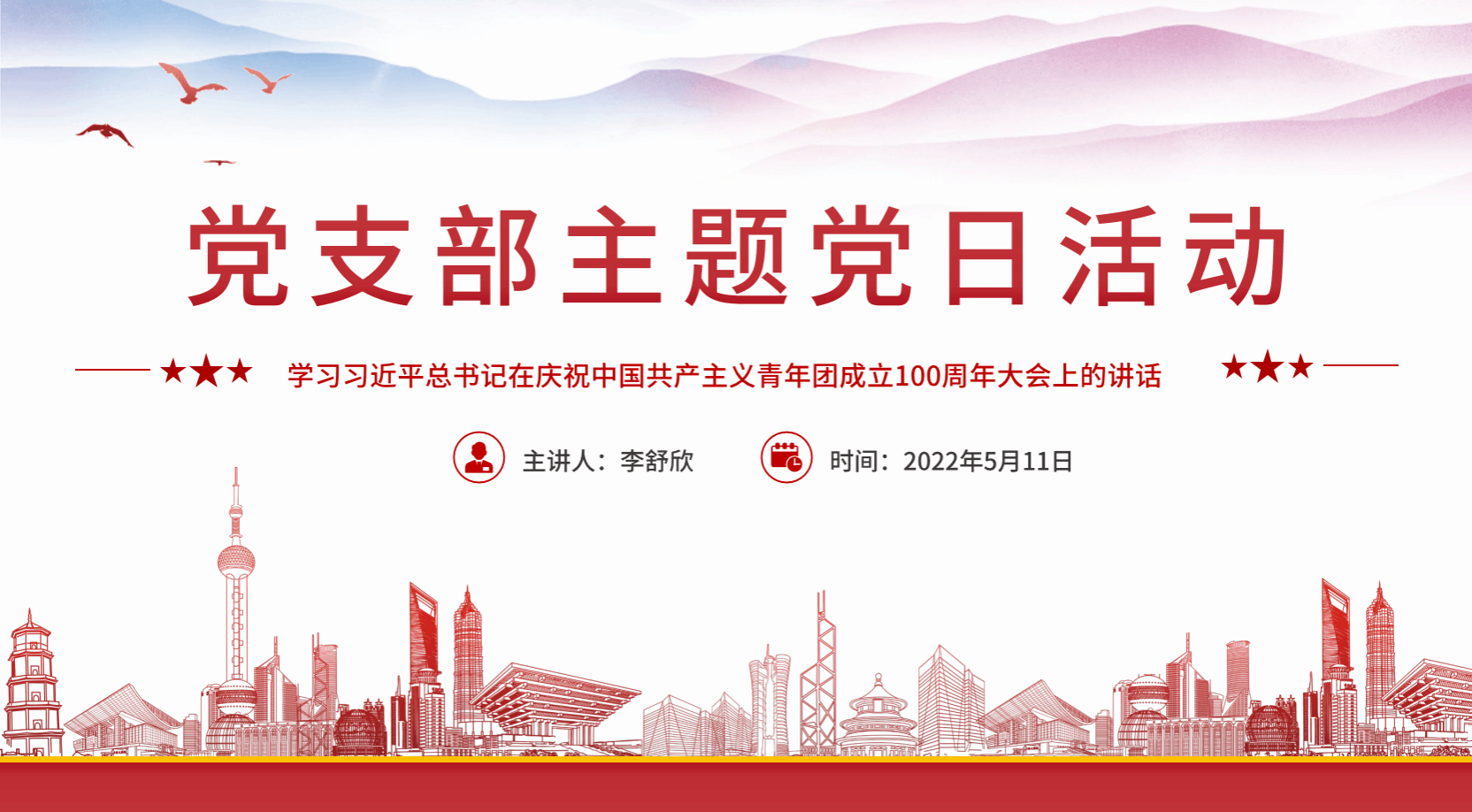 此次会议由支部宣传委员李舒欣同志主持,她从中国共产主义青年团成立相关背景和历史展开讲解,就习近平总书记的重要讲话向支部全体党员的报告。