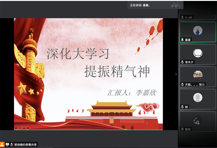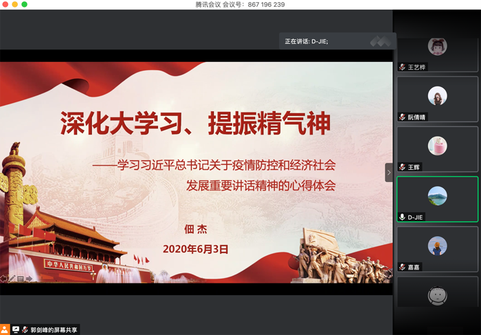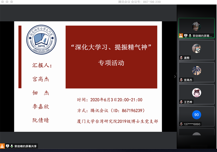 2020年6月3日晚,台湾研究院2019级博士生党支部通过腾讯会议在线上开展了以“深化大学习、提振精气神”为主题的“固定党日+”活动。2019级博士生支部全体党员共同参与了本次学习活动,会议由支部书记郭剑峰主持,李嘉欣、宫高杰、佃杰、阮倩晴等四位党员依次进行了专题汇报。台湾研究院党委副书记陈文老师全程参与,并与各位党员分享、探讨了此次学习活动的心得与体会。
