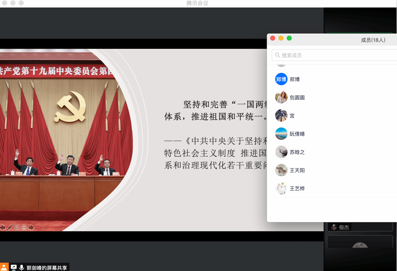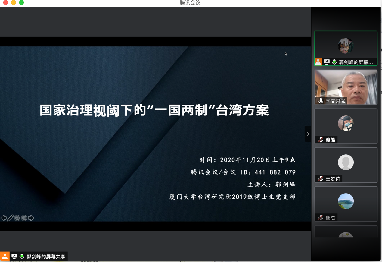 2020年11月20日上午九点,台湾研究院2019级博士生党支部书记郭剑峰为支部全体党员上了一堂专题党课,台湾研究院党委副书记陈文老师、支部入党积极分子以及部分同学共同参与了此次党课。
